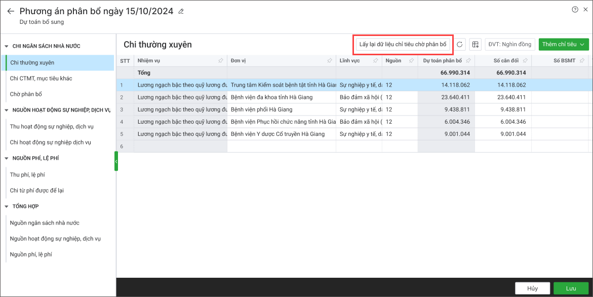 Trong một số trường hợp đơn vị chủ quản cần cập nhật số liệu mới nhất của chỉ tiêu chờ phân bổ: