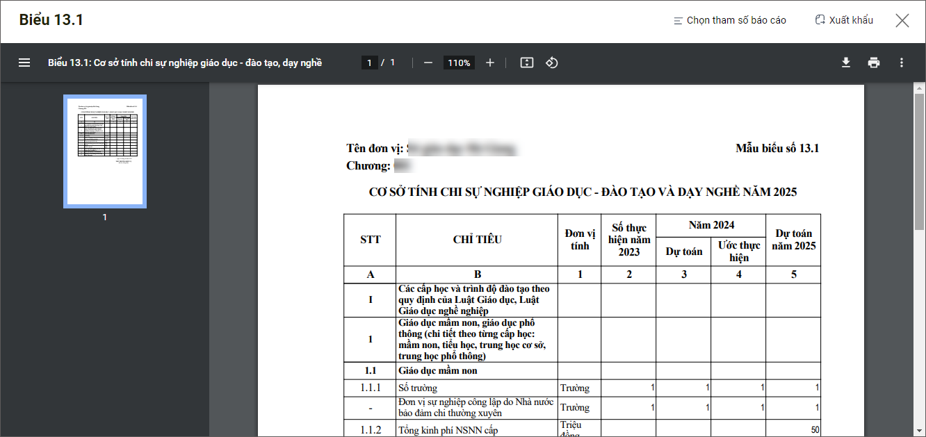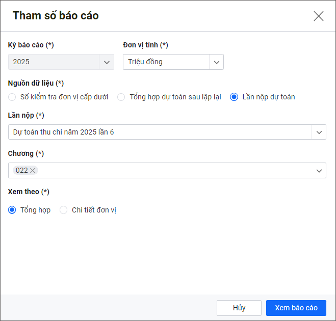 - Khai báo tham số báo cáo và nhấn Xem báo cáo.