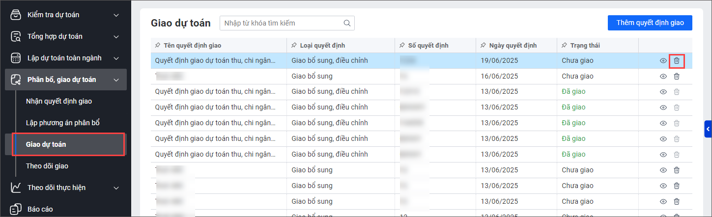 - Tại danh sách Giao dự toán, nhấn Xóa tại quyết định giao dự toán bổ sung, điều chỉnh đã tạo (trạng thái Chưa giao).