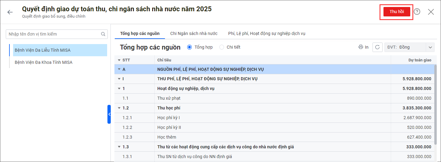 - Tại màn hình xem chi tiết quyết định giao đã giao xuống cho các đơn vị trực thuộc (trạng thái Đã giao), nhấn Thu hồi để lấy lại quyết định giao.