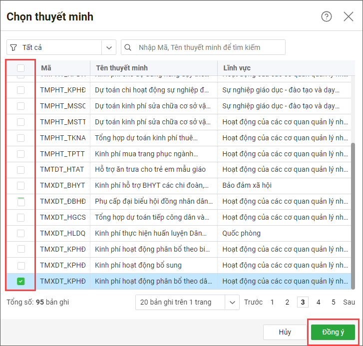 7. Tích chọn nhiệm vụ chi gắn với thuyết minh vừa thiết lập ở trên. Nhấn Đồng ý.