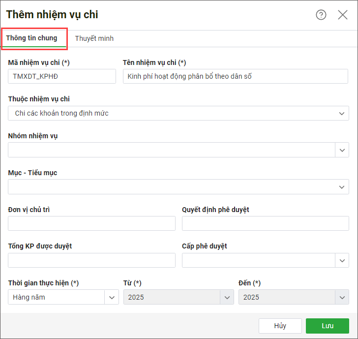 - Chọn thêm các thông tin khác như Thuộc nhiệm vụ chi, Nhóm nhiệm vụ,…