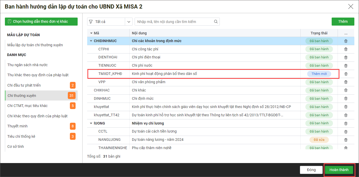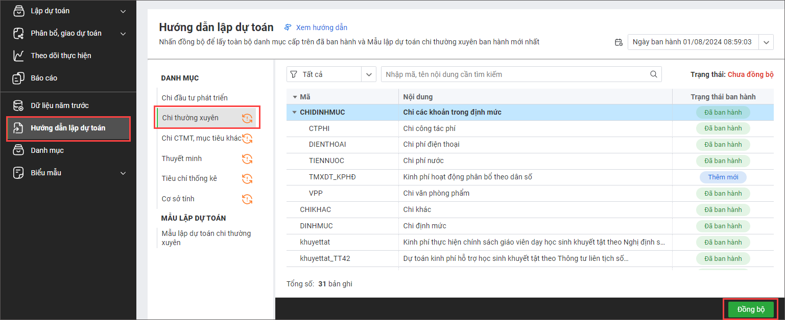 *Lưu ý: Khi đồng bộ danh mục Chi thường xuyên, danh mục Thuyết minh và Cơ sở tính sẽ được tự động cập nhật theo.