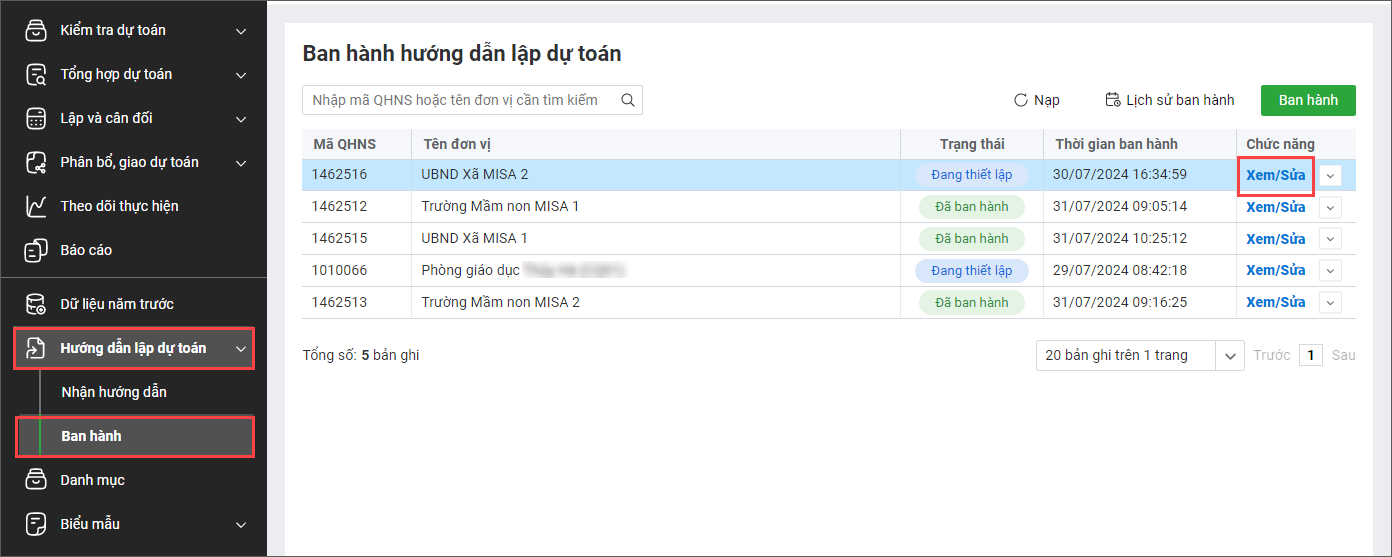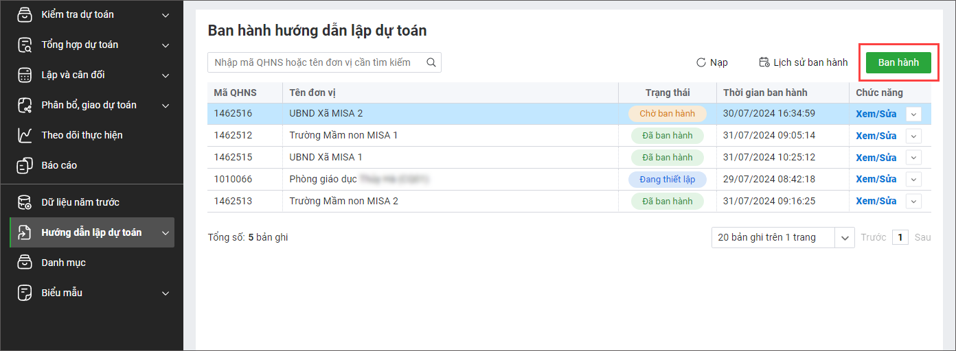 9. Nhấn Ban hành để ban hành hướng dẫn lập dự toán cho cấp dưới.