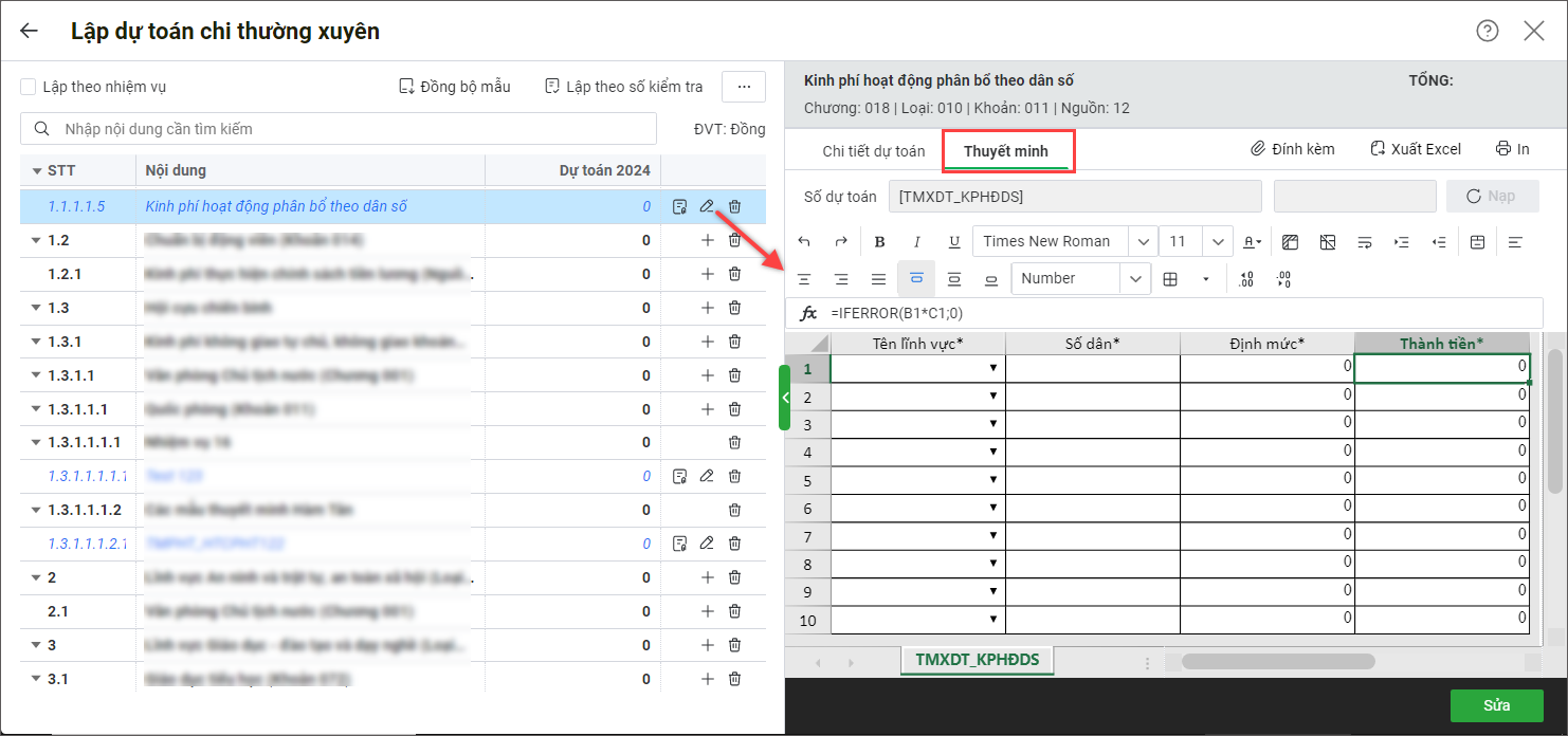 2. Khi lập dự toán Chi thường xuyên, với các nhiệm vụ được cấp trên ban hành kèm thuyết minh chi tiết, đơn vị chỉ cần nhập số liệu theo mẫu thuyết minh đính kèm. Hệ thống sẽ mặc định sẵn công thức tính Số dự toán và tự động tính toán dựa trên dữ liệu đơn vị nhập vào mẫu thuyết minh.