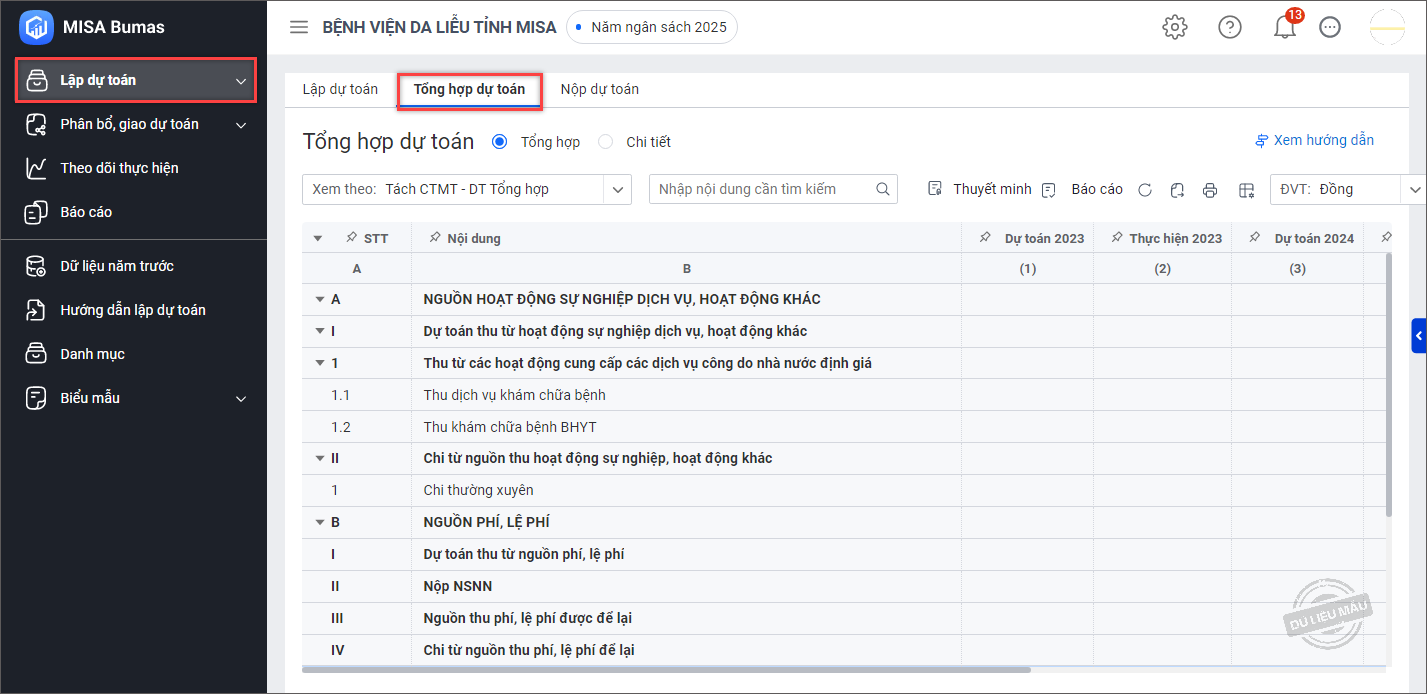 - Vào menu Lập dự toán\Dự toán nhu cầu, chọn tab Tổng hợp dự toán.
