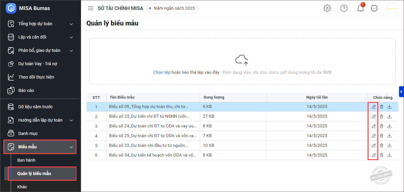 3. Trường hợp cần sửa biểu mẫu, nhấn vào biểu tượng Sửa tại biểu đó.