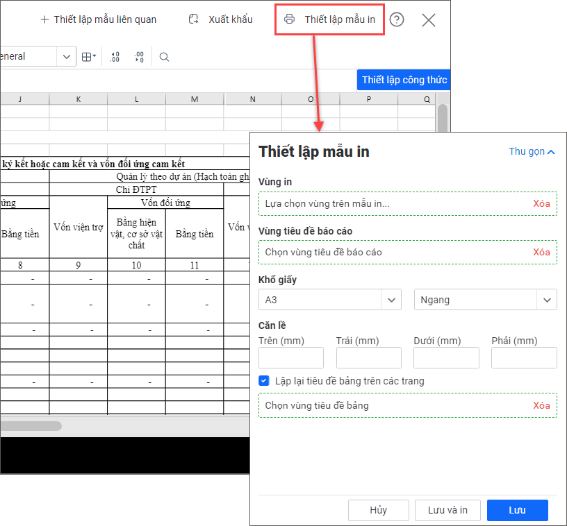 - Chọn Vùng in, Vùng tiêu đề biểu mẫu, Khổ giấy,…