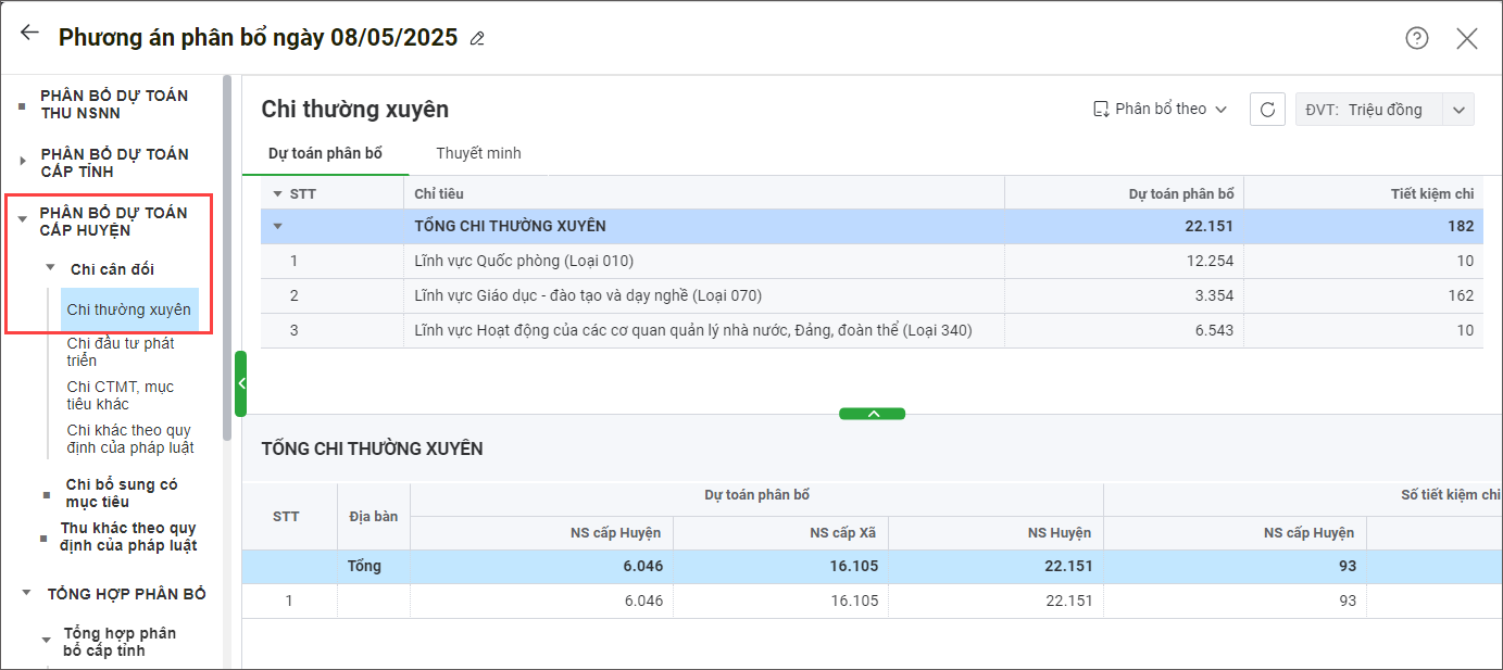 8. Sau khi nhập xong phân bổ chi tiết, phần mềm tự động lấy số liệu lên chỉ tiêu vừa thực hiện phân bổ.