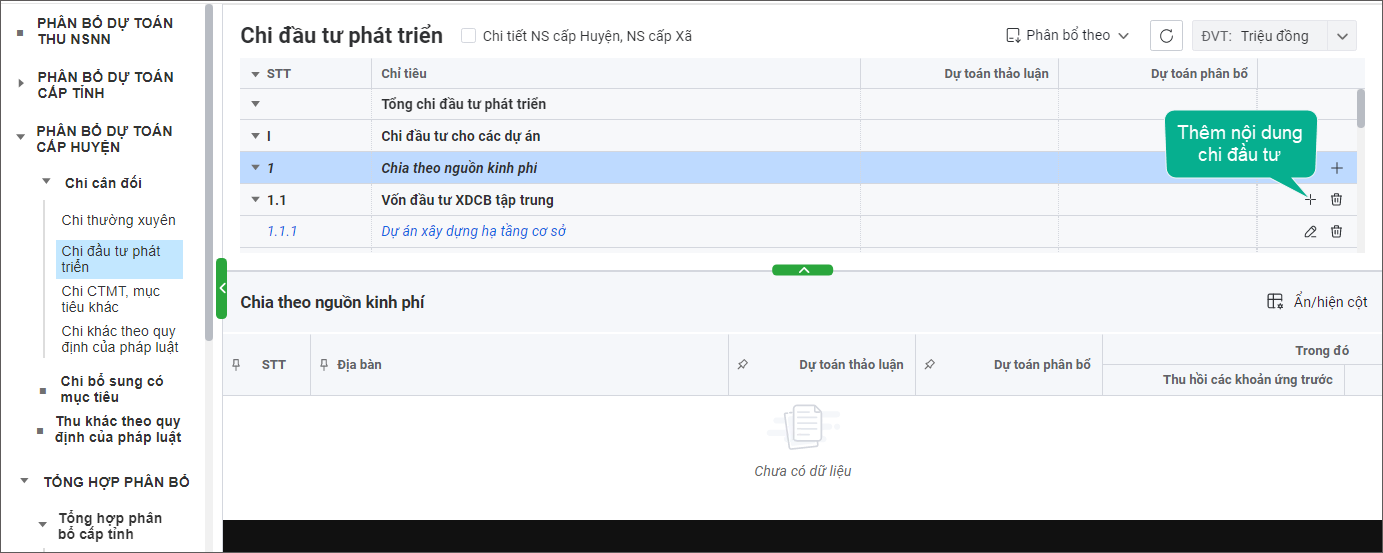 4. Nhấn vào biểu tượng dấu + để thêm nội dung chi đầu tư cần phân bổ.