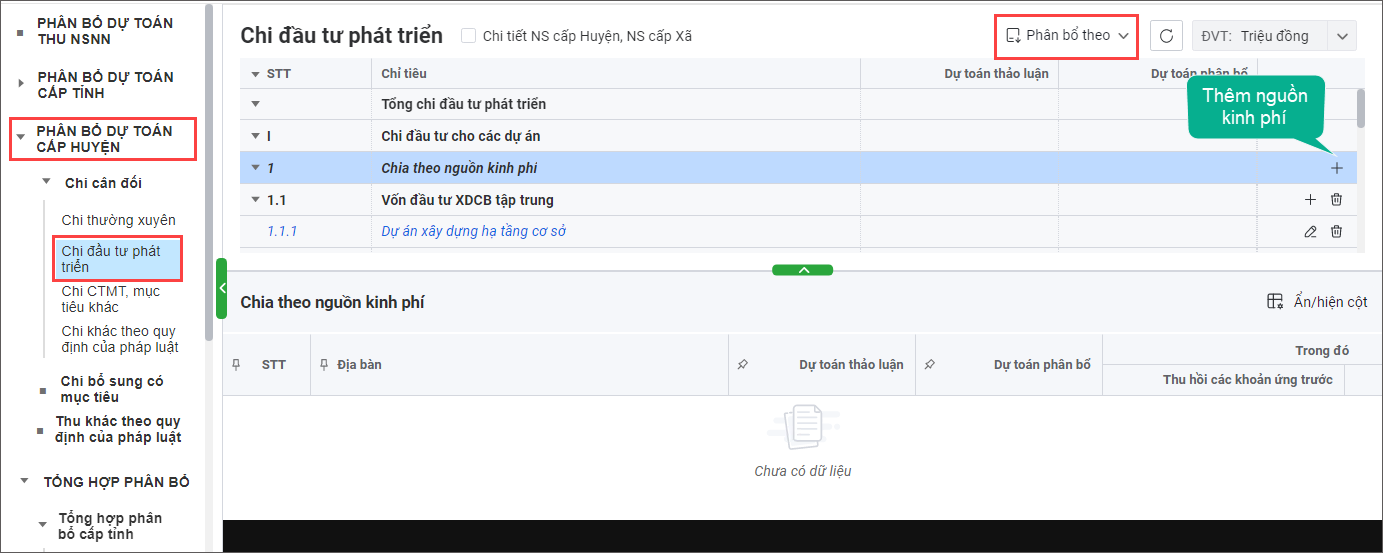 3. Trường hợp cần thêm nguồn kinh phí để phân bổ, nhấn Thêm nguồn kinh phí.