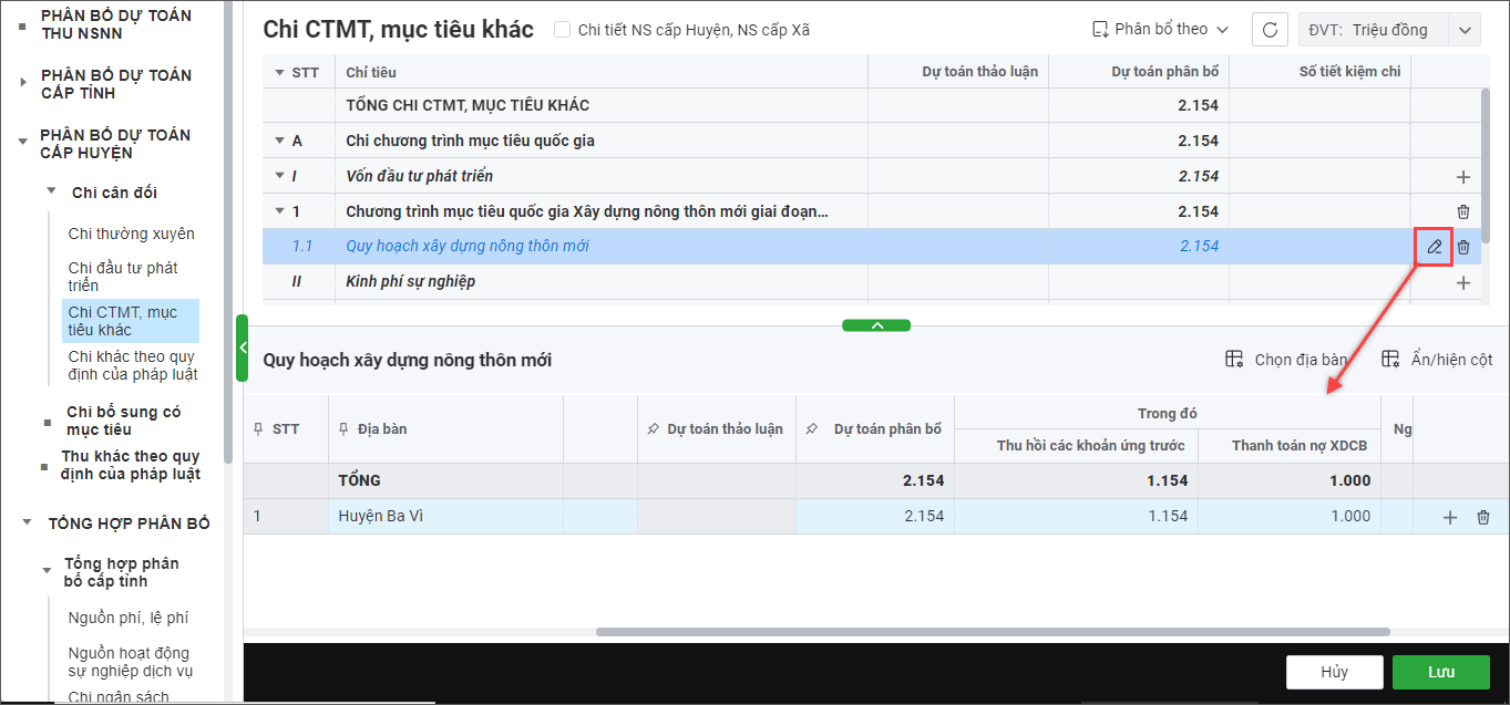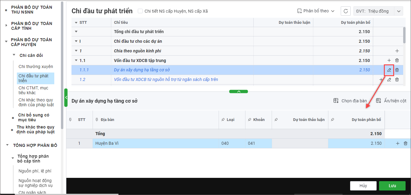 6. Nhấn vào biểu tượng Sửa tại nội dung cần thực hiện phân bổ.