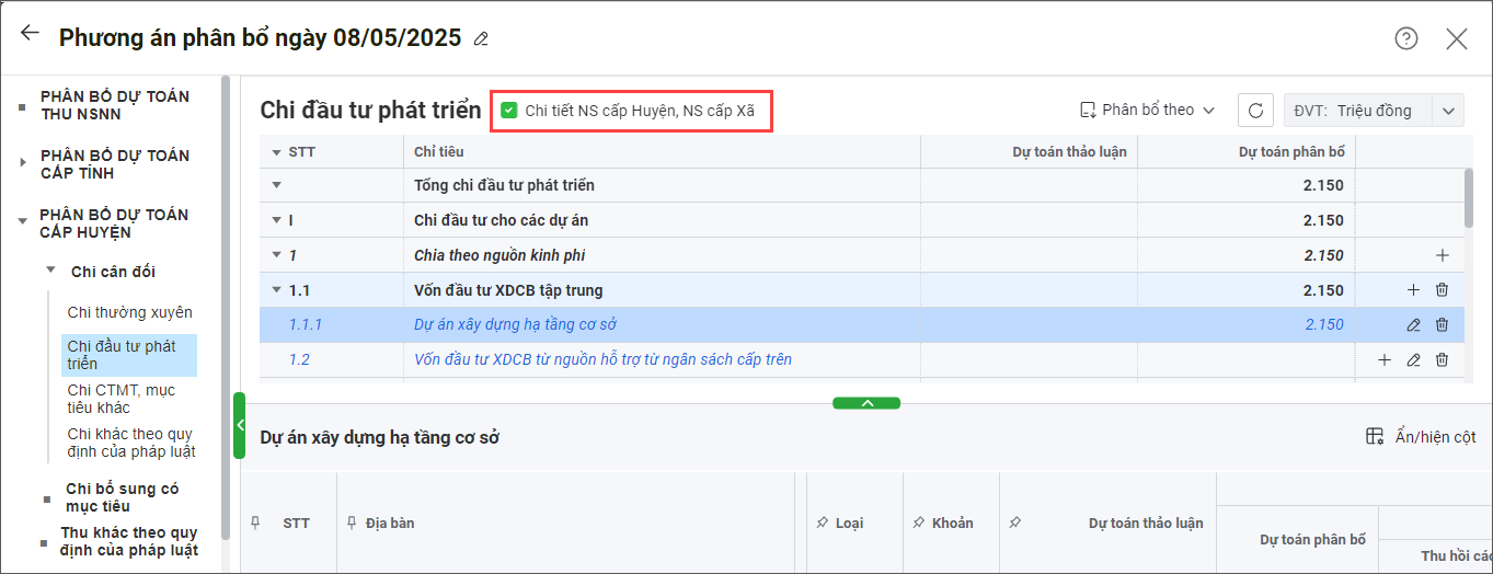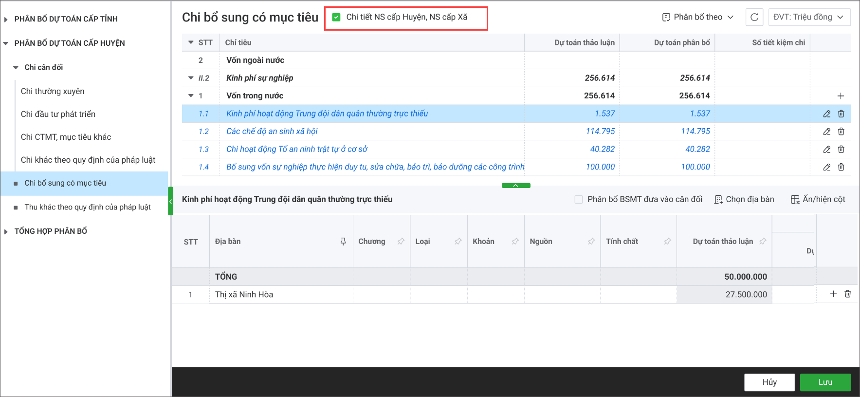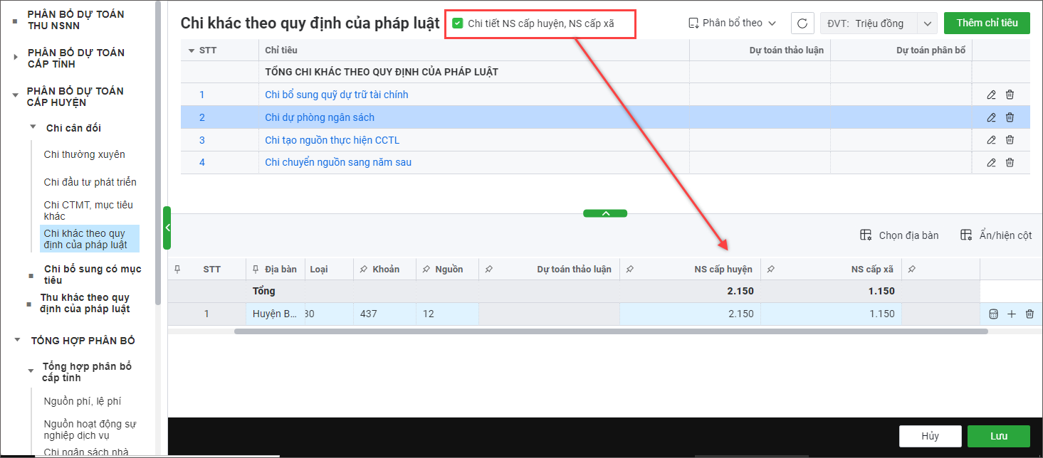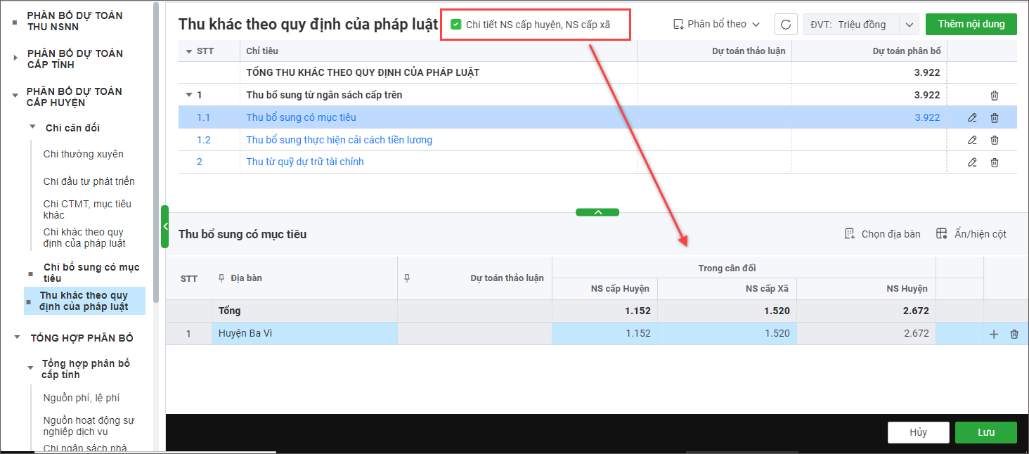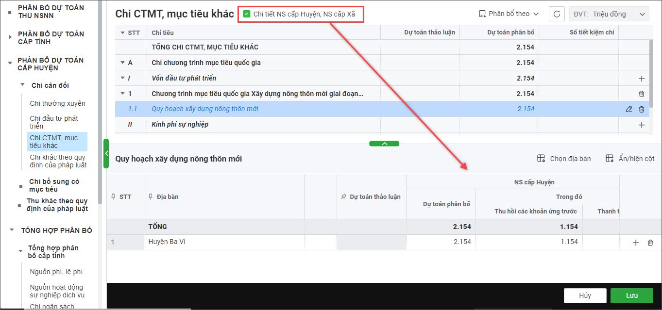 8. Trường hợp cần phân bổ chi tiết đến cấp Huyện, cấp Xã, tích chọn vào ô Chi tiết NS cấp Huyện, NS cấp Xã.