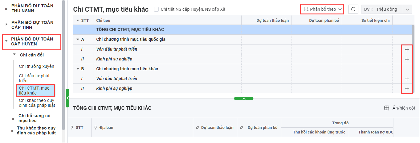 1. Vào phần Phân bổ dự toán cấp huyện, chọn Chi cân đối\Chi CTMT, mục tiêu khác.