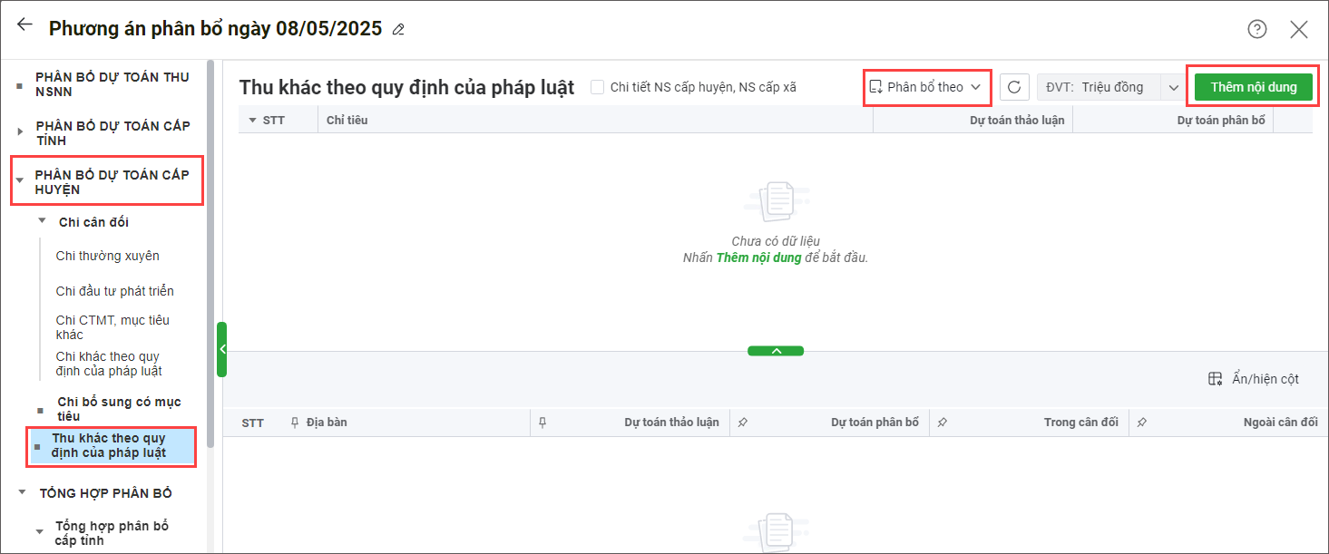 3. Để thêm chỉ tiêu cần phân bổ, nhấn Thêm nội dung.