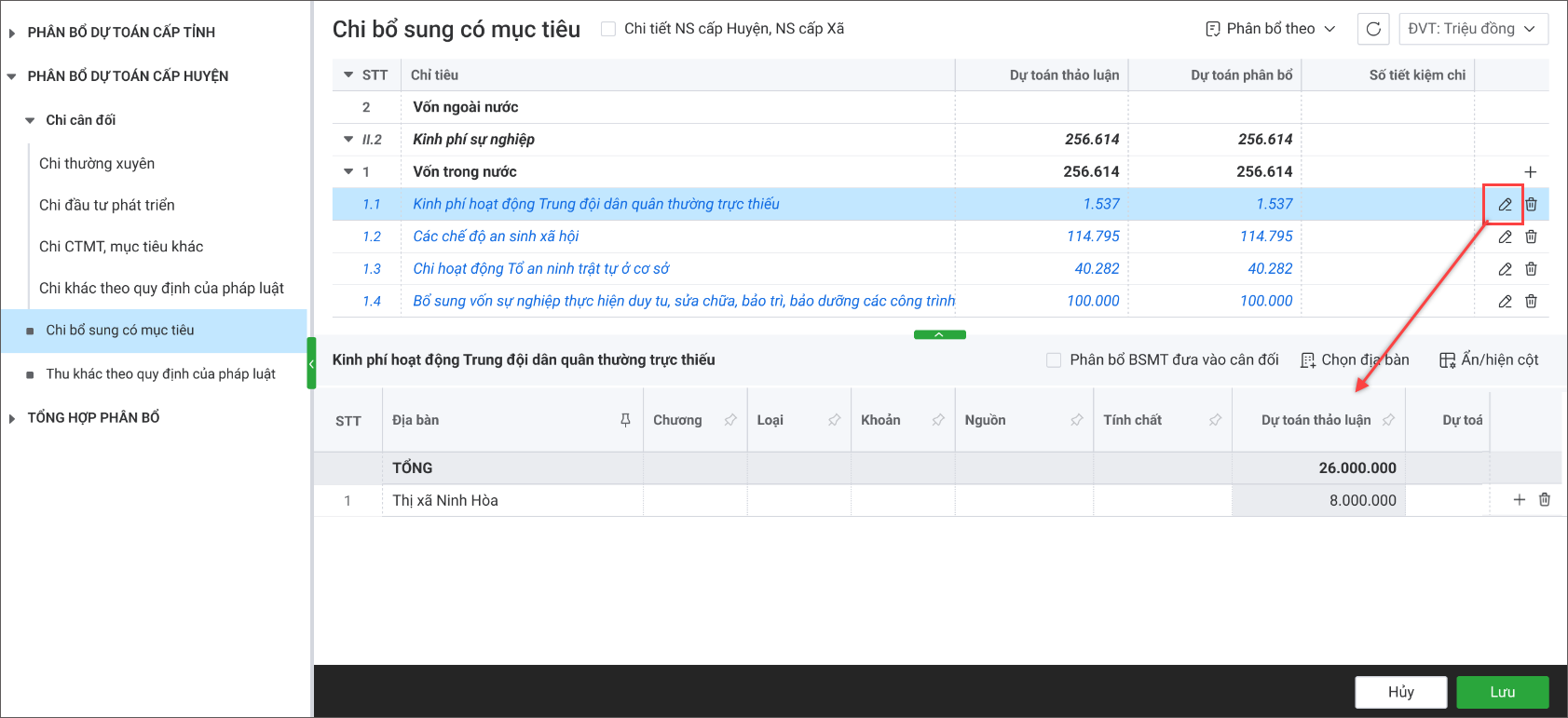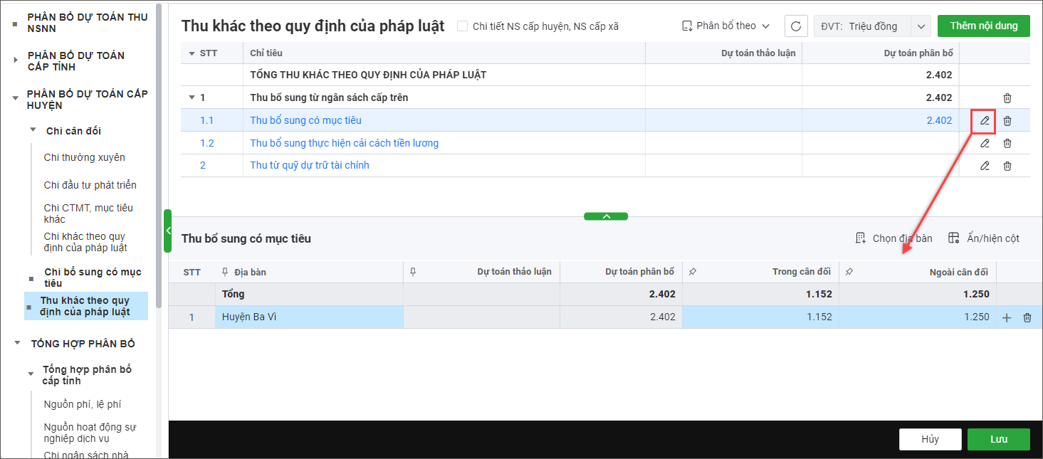 4. Nhấn Sửa tại dòng chỉ tiêu cần thực hiện phân bổ.