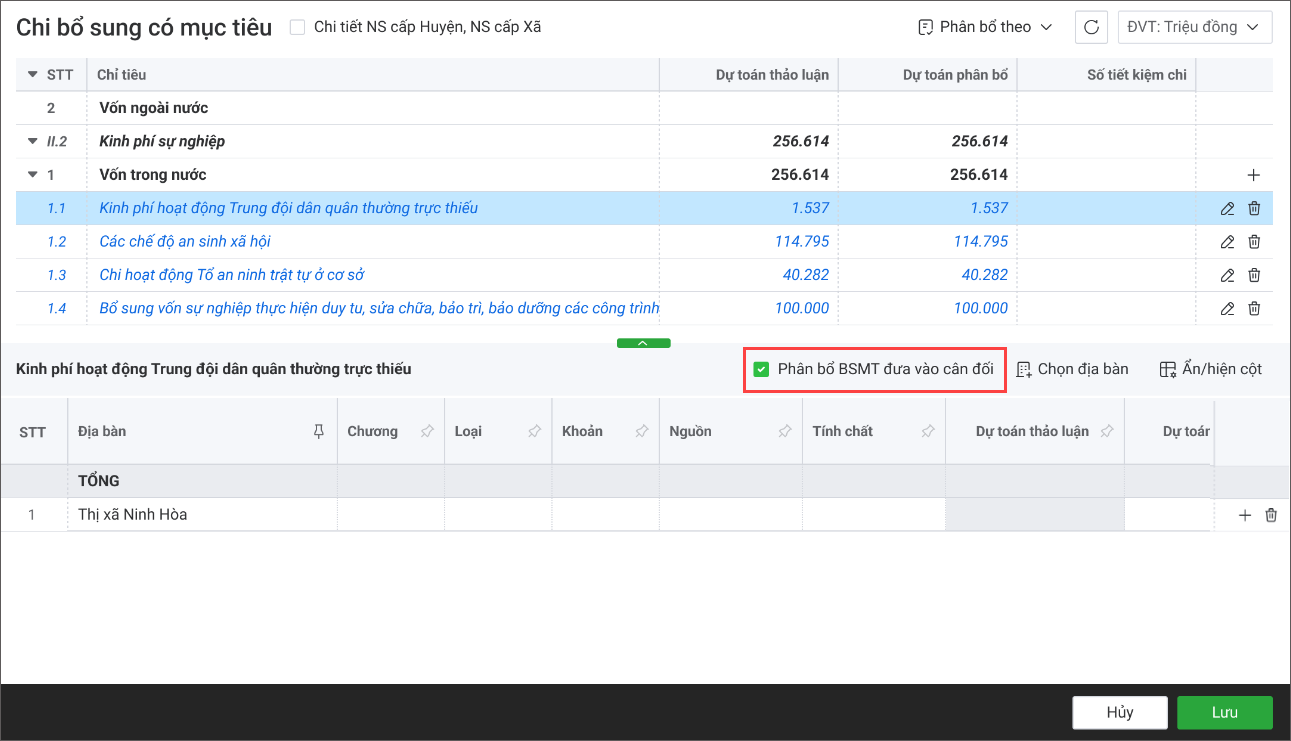 5. Nhập số phân bổ chi tiết cho từng đơn vị.