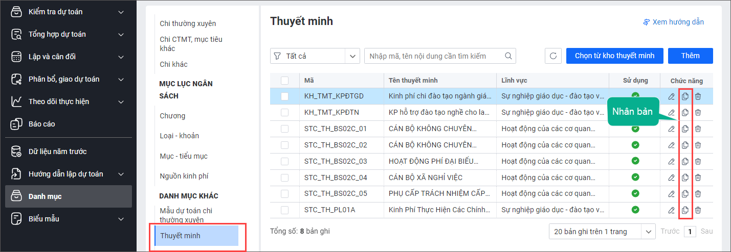 – Kể từ phiên bản R14: Phần mềm bổ sung thêm tính năng Nhân bản tại danh mục Thuyết minh. Khi nhân bản thì hệ thống sẽ tự động sao chép bảng dữ liệu, Mẫu in của thuyết minh nguồn sang thuyết minh được nhân bản.