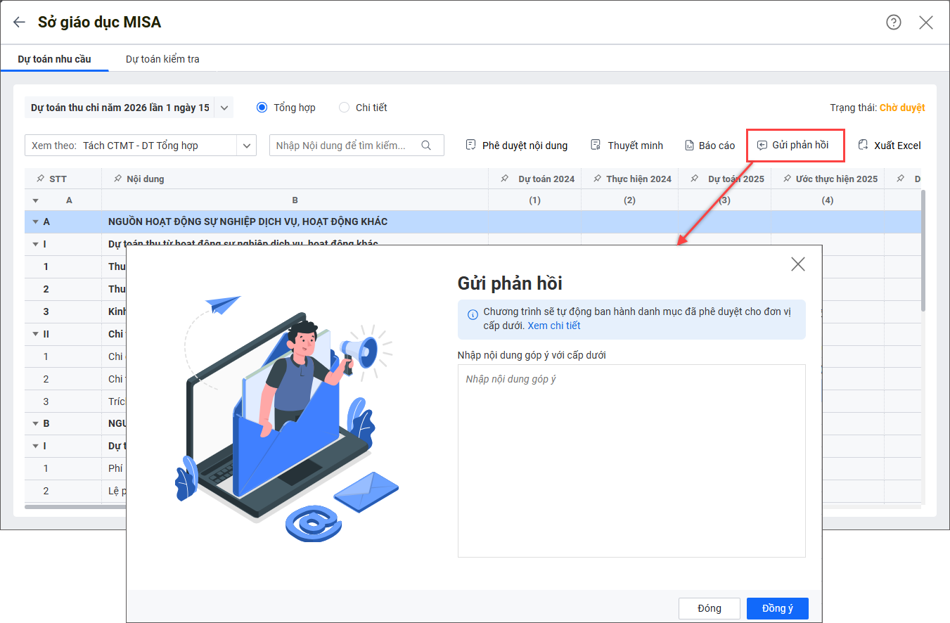 Kể từ phiên bản R16: Phần mềm bổ sung chức năng Gửi phản hồi tại màn hình Dự toán nhu cầu khi STC kiểm tra dự toán của đơn vị trực thuộc.