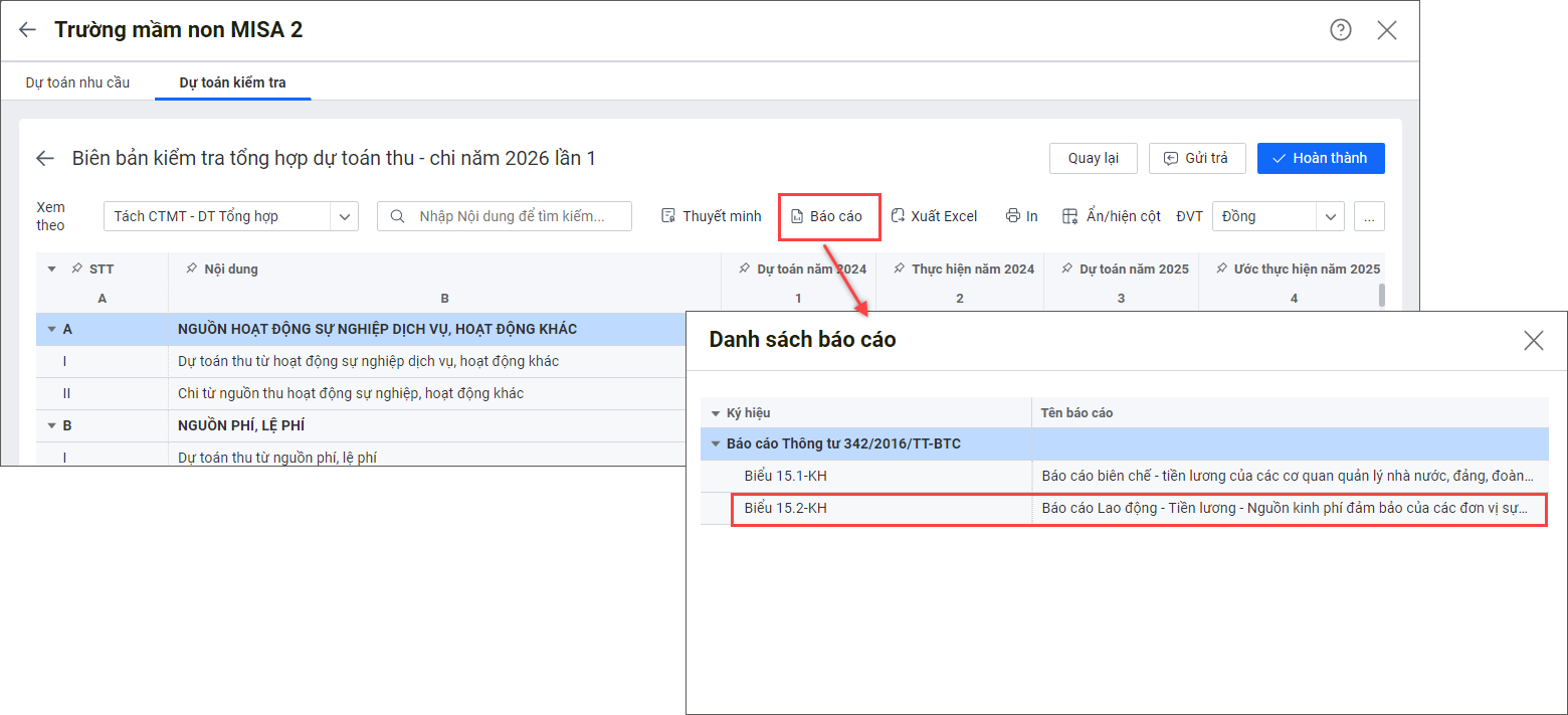 Khi lập dự toán 2026, Xã thuộc tỉnh Khánh Hòa cần in báo cáo “Biểu 15.2: Báo cáo Lao động – Tiền lương – Nguồn kinh phí đảm bảo của các đơn vị sự nghiệp” để đối chiếu số liệu.