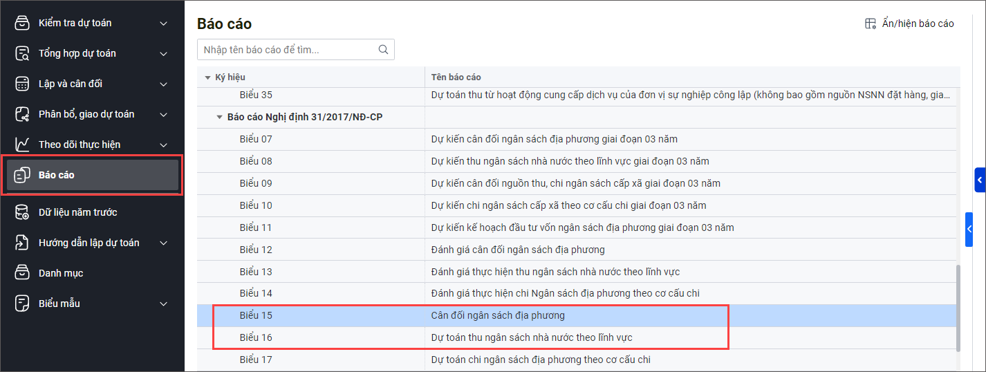 Kể từ phiên bản R17: Phần mềm đáp ứng cho Xã/Phường có thể in Mẫu biểu 15: Cân đối ngân sách địa phương Mẫu biểu 16: Dự toán thu ngân sách nhà nước theo lĩnh vực.