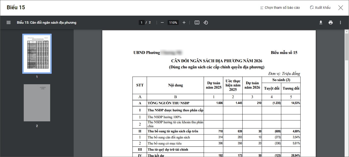 Đáp ứng cho Xã/Phường in Mẫu biểu 15: Cân đối ngân sách địa phương và Mẫu biểu 16: Dự toán thu ngân sách nhà nước theo lĩnh vực.