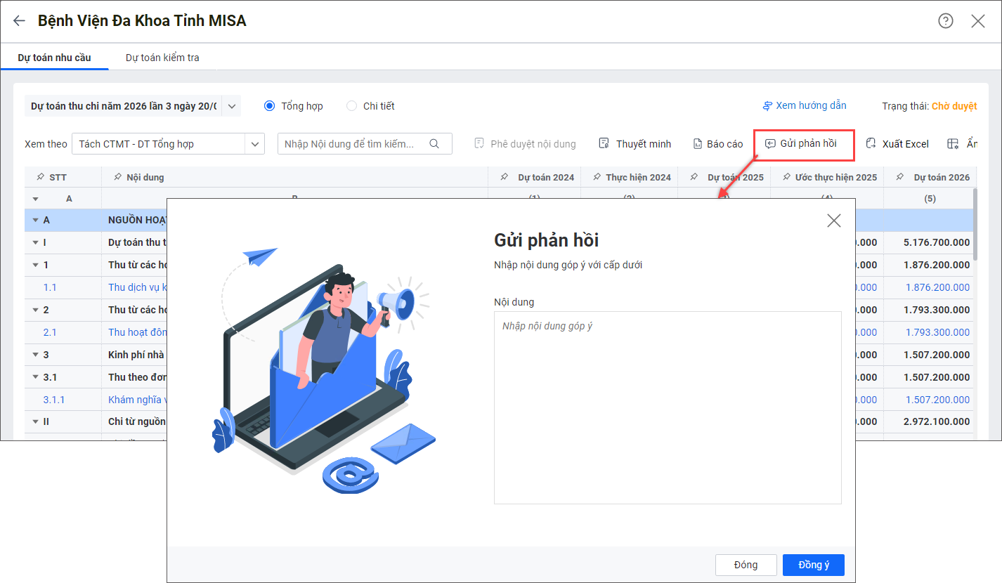 - Chuyên viên đơn vị chủ quản có thể gửi phản hồi cho đơn vị cấp dưới khi xem dự toán nhu cầu nêu đơn vị toán quá sơ sài.