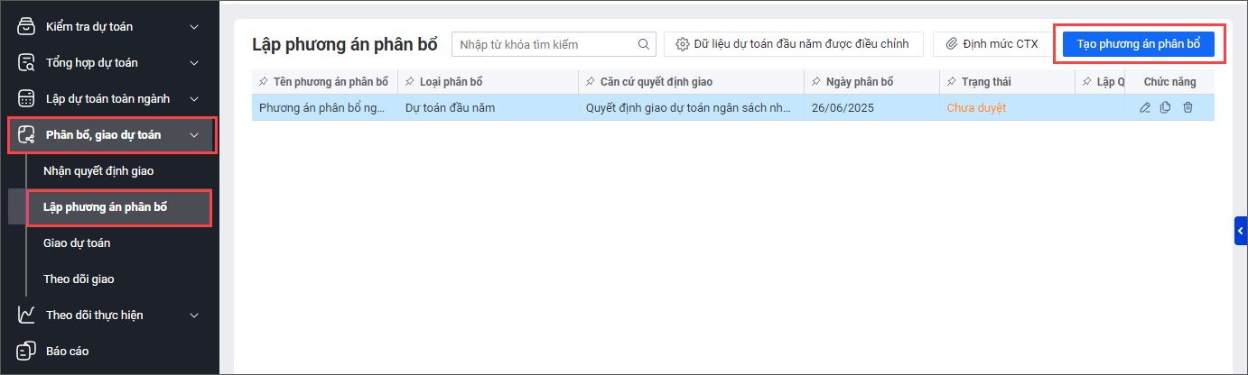 1. Chọn menu Phân bổ, giao dự toán\Lập phương án phân bổ.