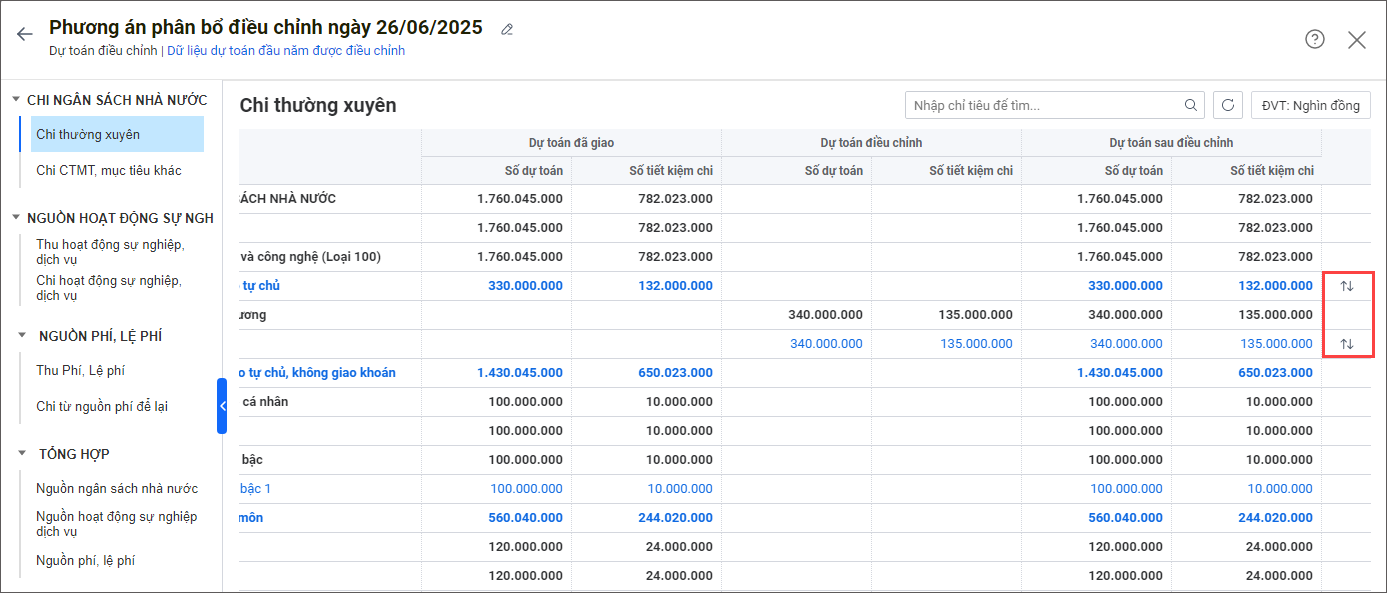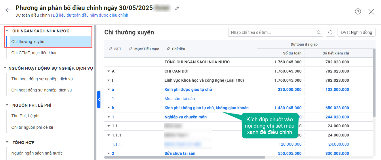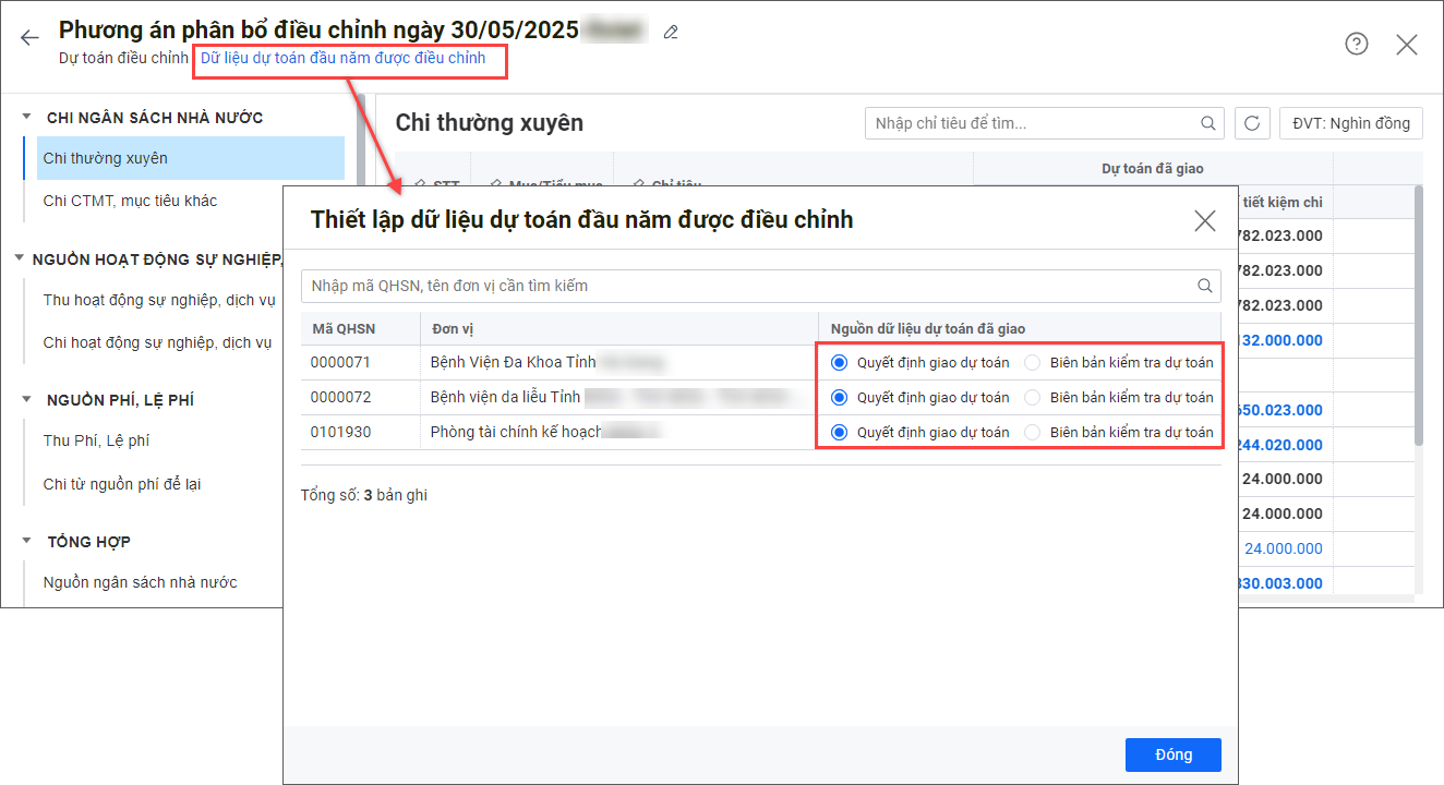 3. Trường hợp cần thiết lập nguồn dữ liệu dự toán đầu năm được điều chỉnh, nhấn vào Dữ liệu dự toán đầu năm được điều chỉnh.