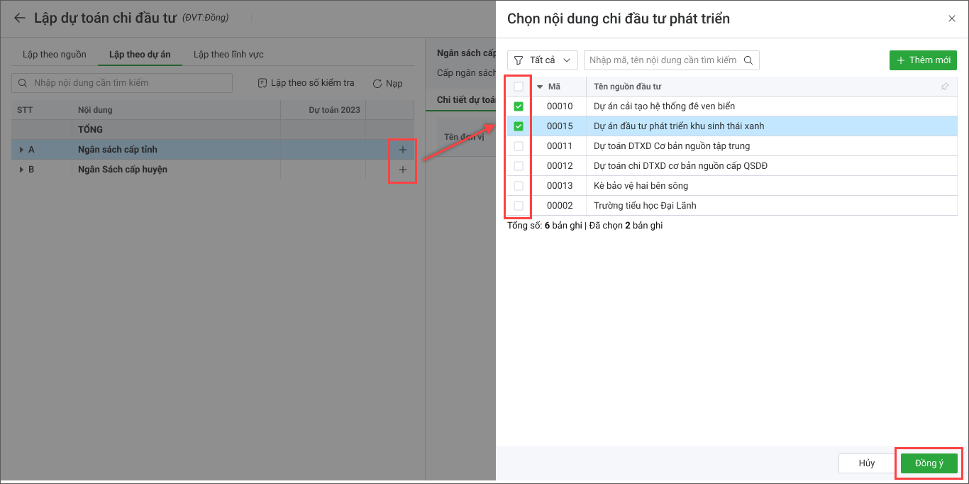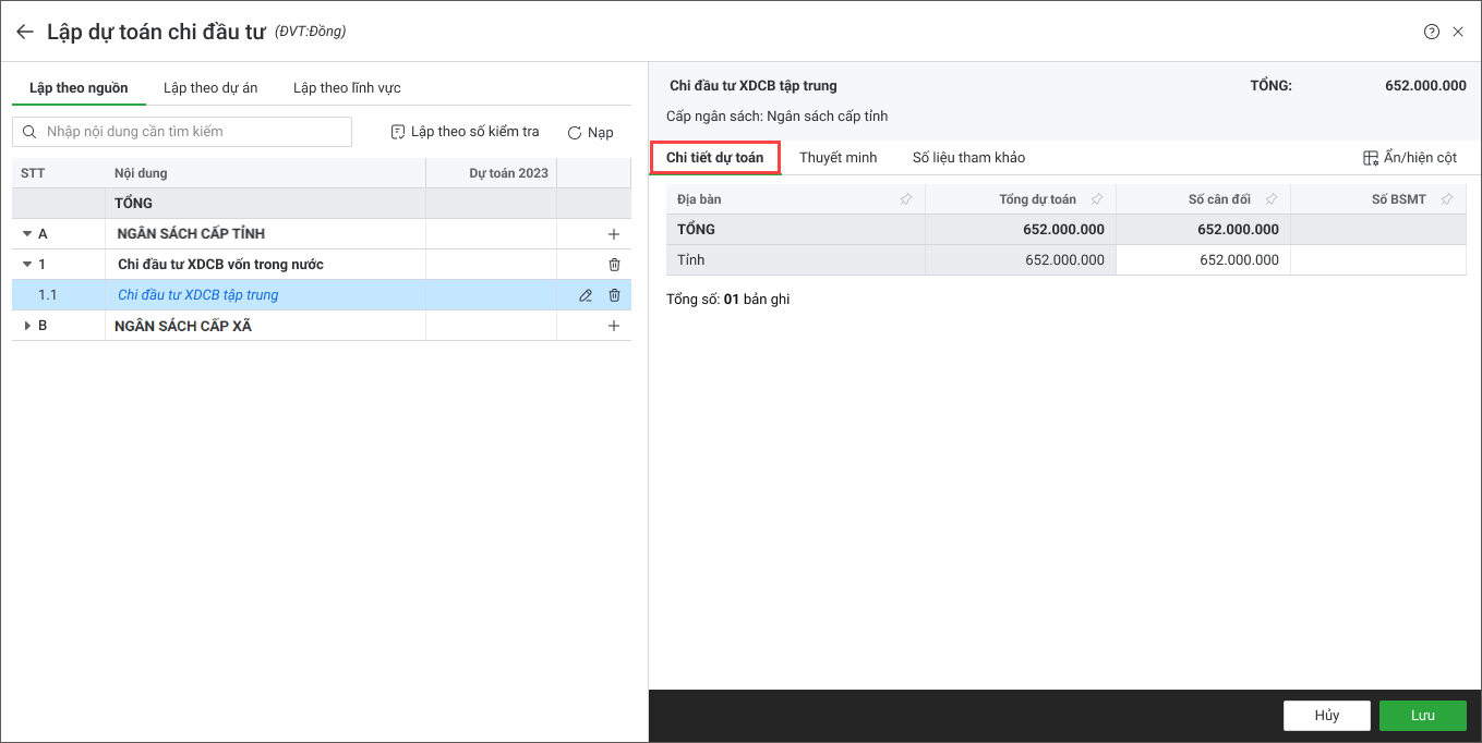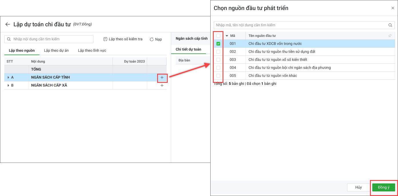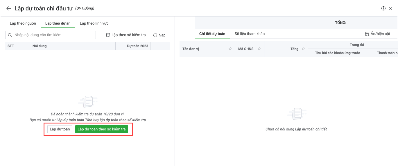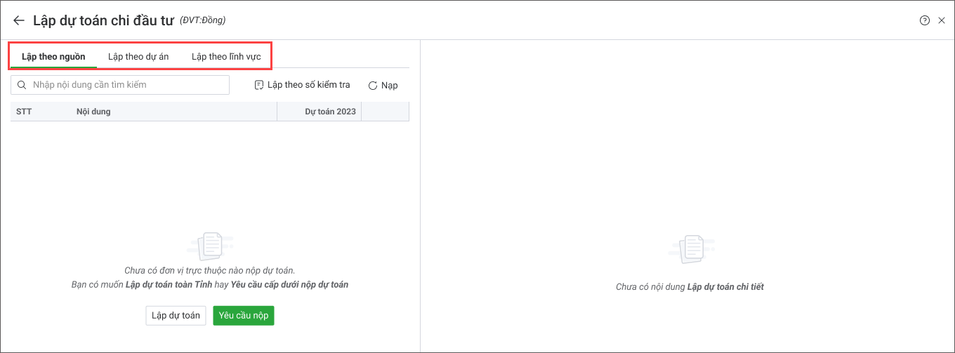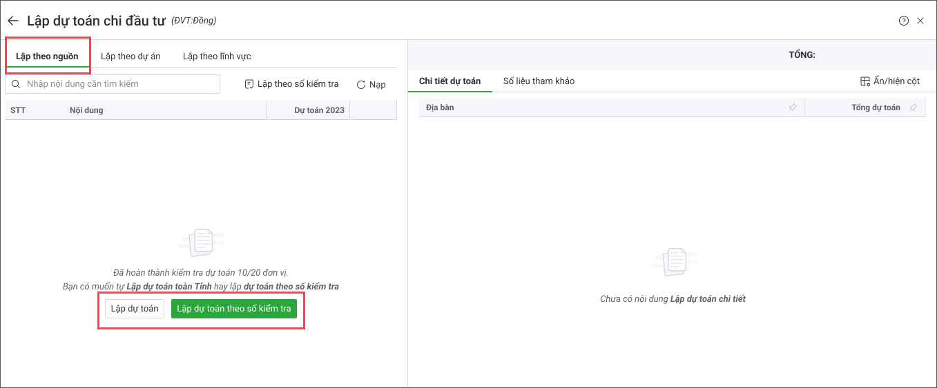 - Chọn Lập theo nguồn hoặc Lập theo dự án, Lập theo lĩnh vực.