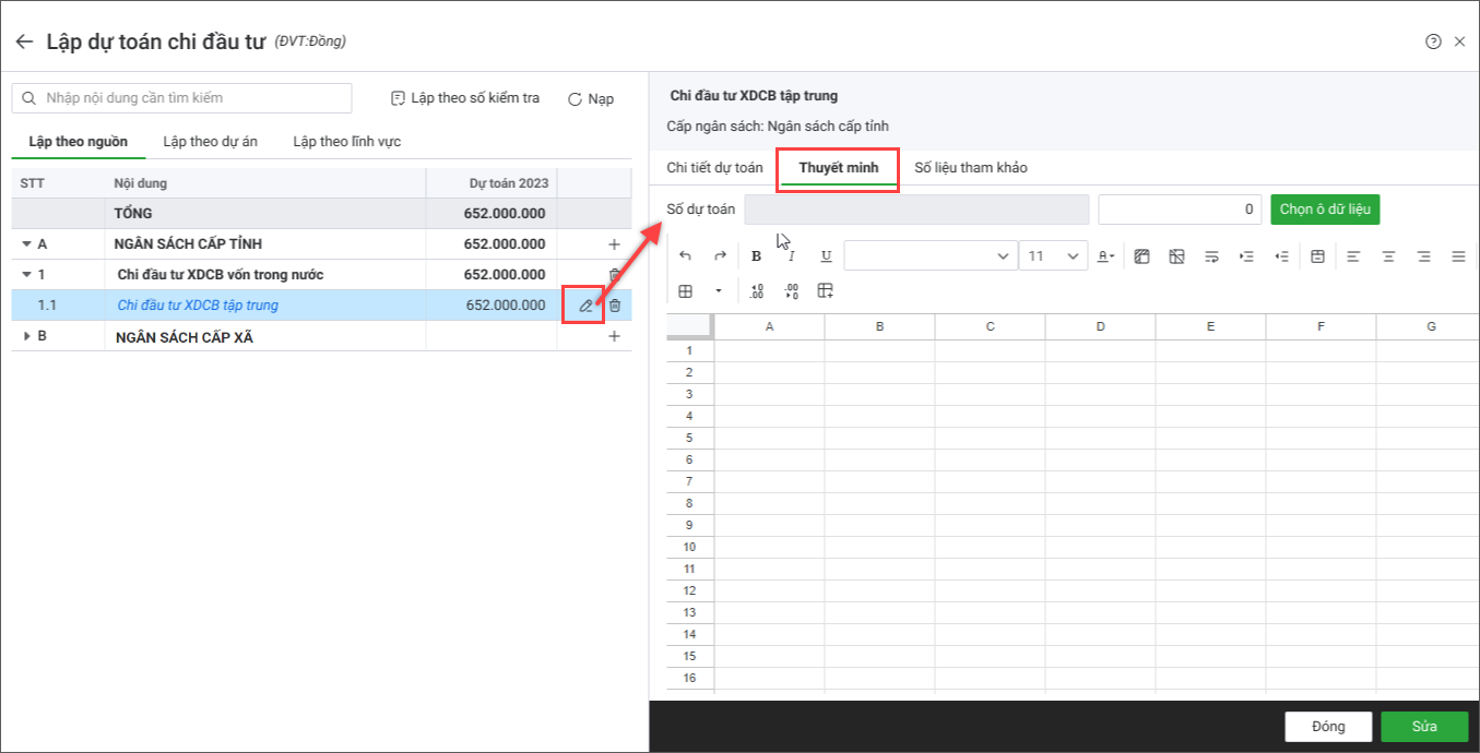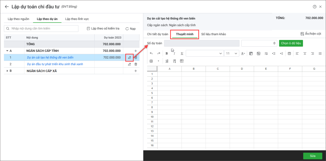 3. Kích đúp chuột hoặc nhấn Sửa tại lĩnh vực chi tiết cần lập dự toán (màu xanh).