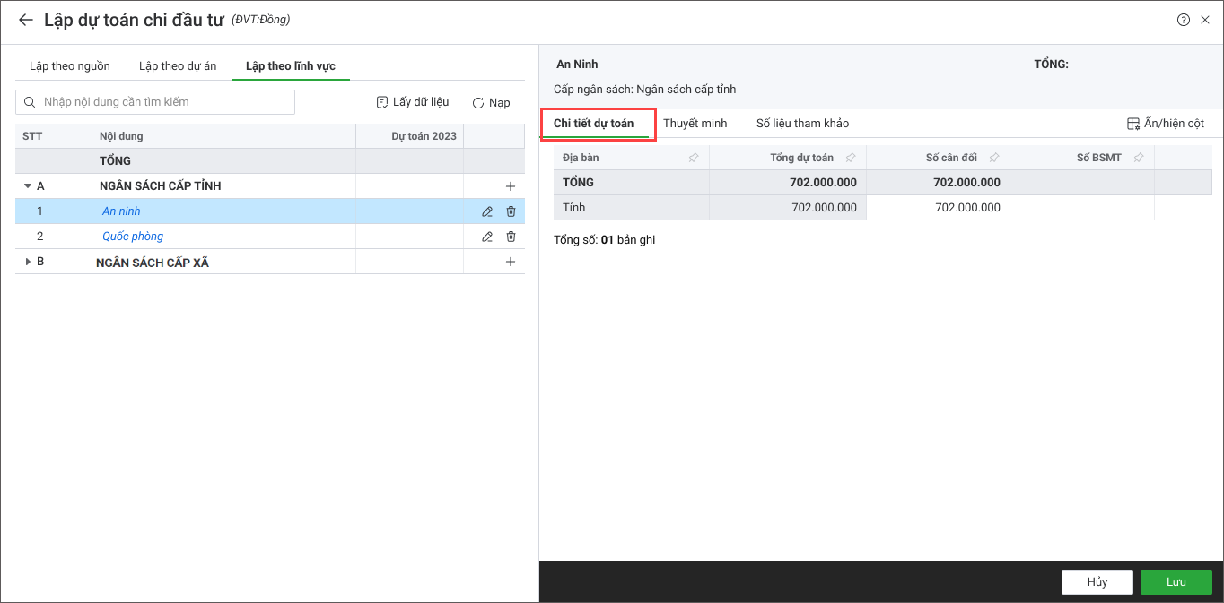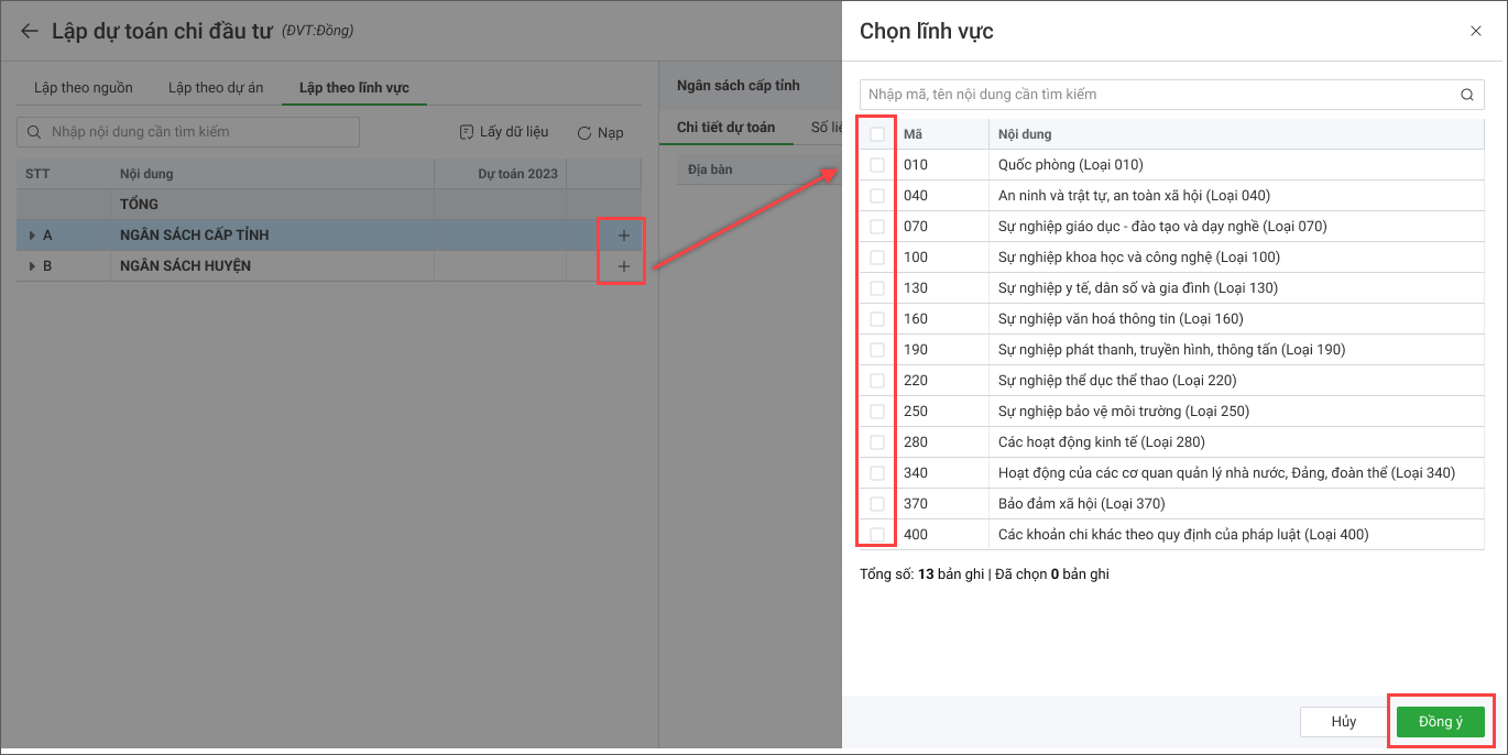 - Tích chọn các lĩnh vực cần lập dự toán.