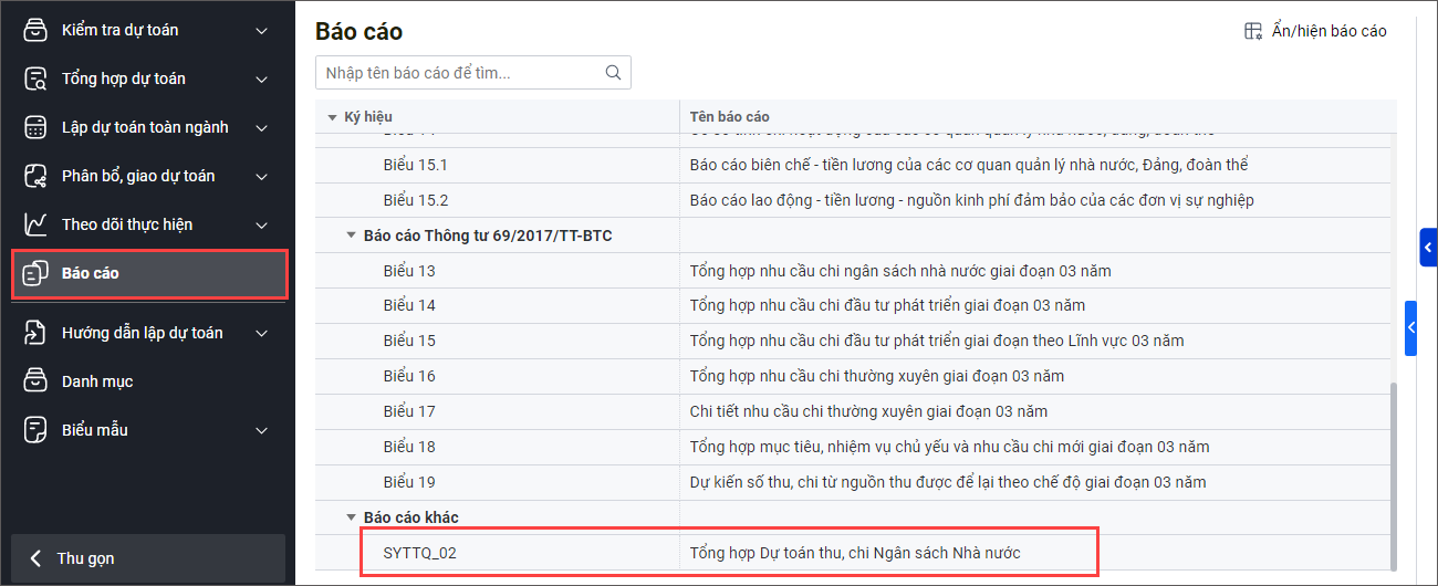 - Đơn vị in biểu SYTTQ_01: Tổng hợp Dự toán thu, chi Ngân sách Nhà nước tại mục Tổng hợp dự toán\Dự toán nhu cầu\Báo cáo hoặc in tại mục Báo cáo.