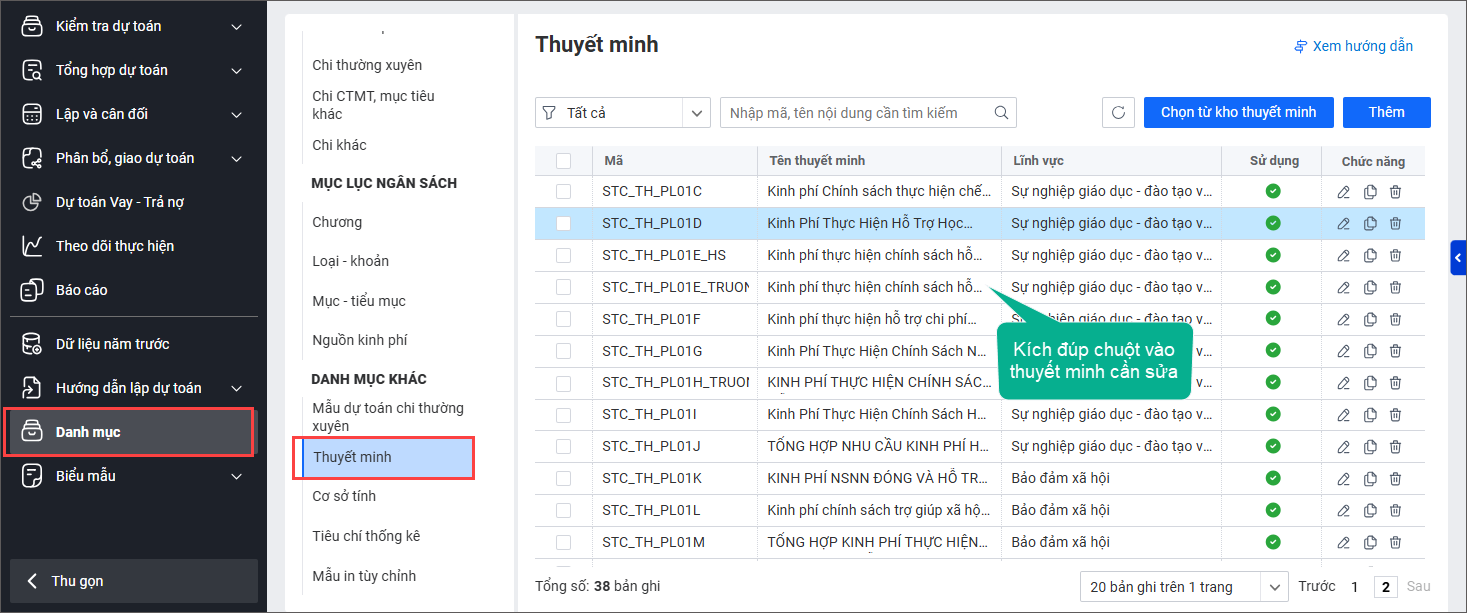 - Trên phần mềm, vào menu Danh mục, chọn Thuyết minh.