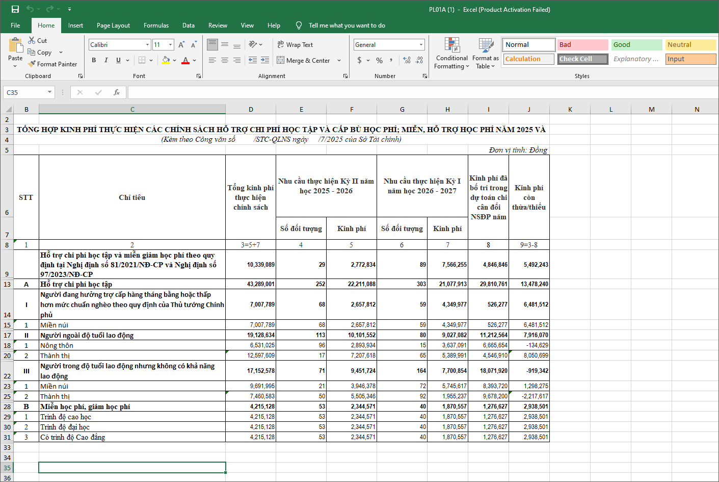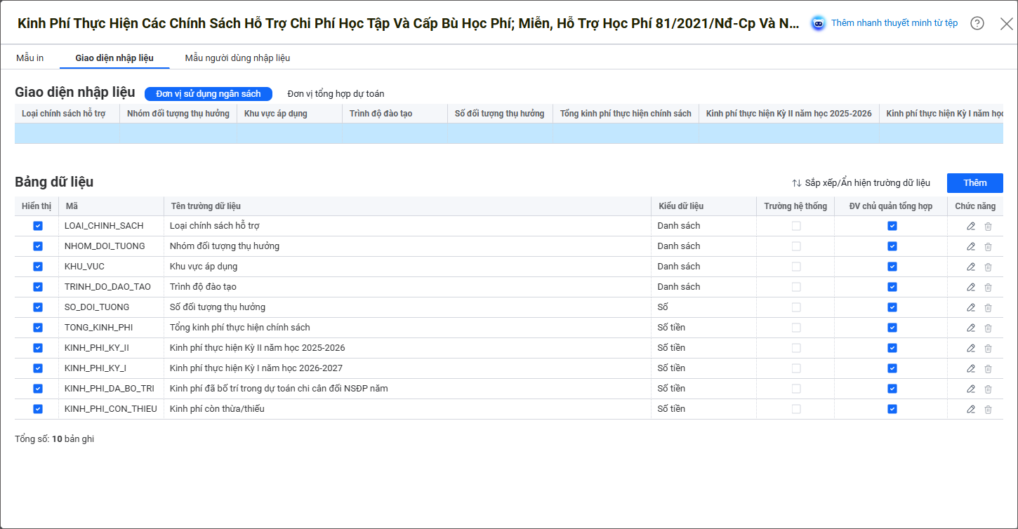 Ví dụ: Đơn vị cần xây dựng bảng dữ liệu thuyết minh trên phần mềm từ mẫu biểu dưới đây: