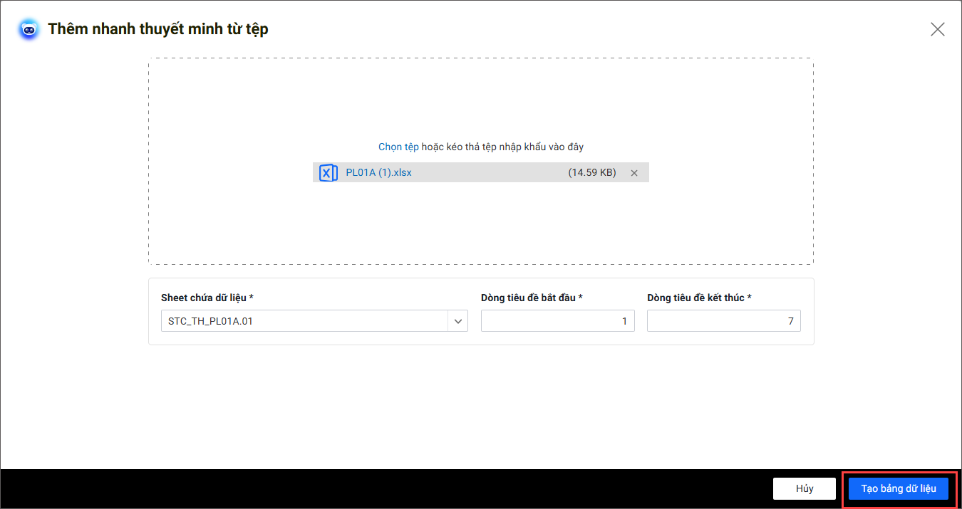 - Hệ thống tự động nhận diện Sheet chứa dữ liệu, Dòng tiêu đề bắt đầu, Dòng tiêu đề kết thúc. Nhấn Tạo bảng dữ liệu.