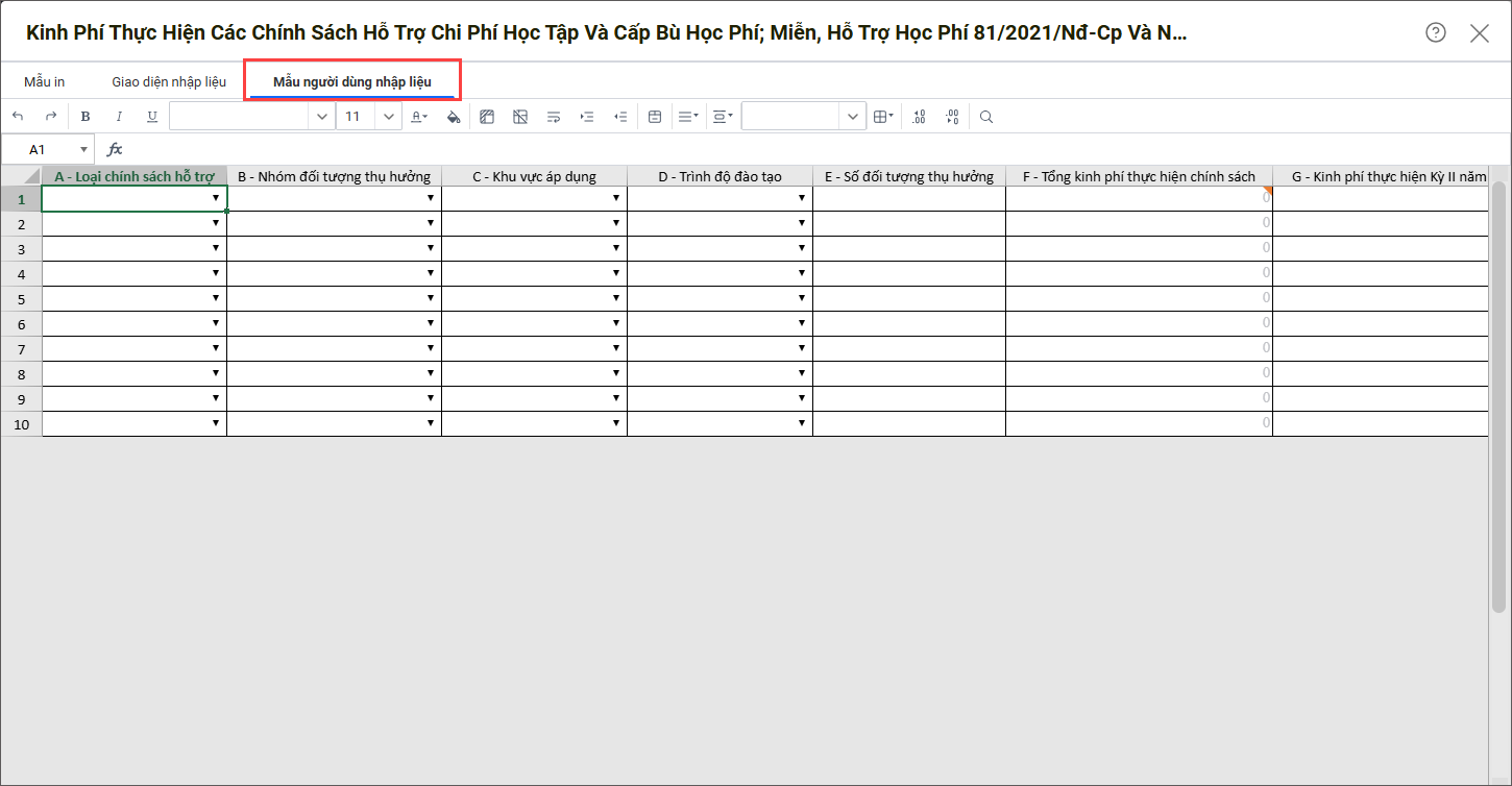 - Có thể vào mục Mẫu người dùng nhập liệu để xem thử giao diện nhập liệu của các đơn vị cấp dưới.