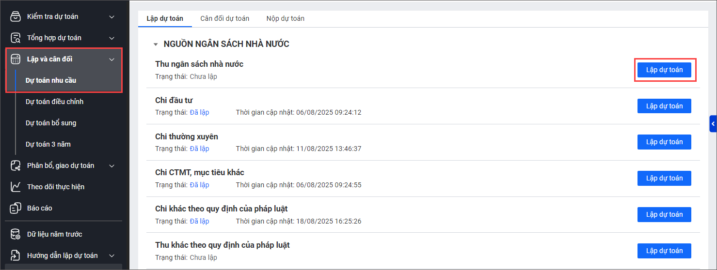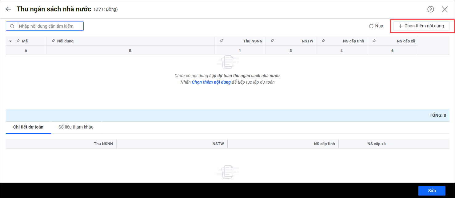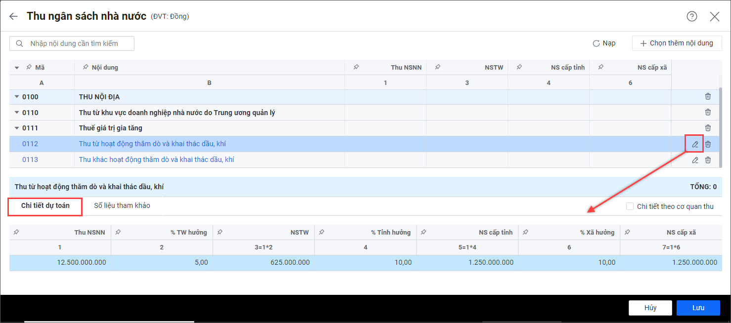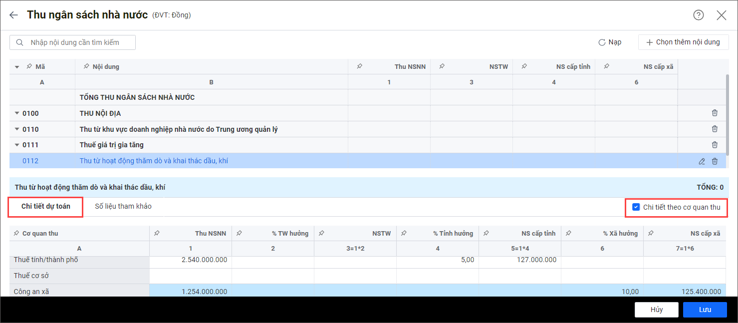 Xã lập dự toán Thu ngân sách nhà nước Giúp đơn vị lập dự toán thu Ngân sách nhà nước (NSNN) cho năm kế hoạch để báo cáo Sở tài chính. Các bước thực hiện: Nhận hướng dẫn lập dự toán từ cấp trên Xem hướng dẫn tại đây Lập dự toán thu NSNN 1. Chọn menu Lập dự toán\Dự toán nhu cầu. 2. Nhấn Lập dự toán tại Thu ngân sách nhà nước. 3. Nhấn Chọn thêm nội dung. Tích chọn các nội dung thu cần thêm. Nhấn Đồng ý. 4. Trường hợp đơn vị tự đứng ra thu NSNN mà không phân theo cơ quan thu: Nhấn Sửa tại nội dung thu chi tiết (màu xanh). Nhập dự toán tại tab Chi tiết dự toán. Sau khi nhập xong, nhấn Lưu. 5. Trường hợp đơn vị không đứng ra thu NSNN mà phân cho các cơ quan thu khác thực hiện: Nhấn Sửa tại nội dung thu chi tiết (màu xanh). Tích chọn vào ô Chi tiết theo cơ quan thu. Nhập dự toán tương ứng với từng cơ quan thu. Sau khi nhập xong, nhấn Lưu. Cập nhật 21/08/2025 Bài viết này hữu ích chứ? Có Không Bài viết liên quan Xã/Phường thiết lập danh mục Trần chi Xã/Phường nộp dự toán 3 năm lên cấp trên Xã/Phường tổng hợp dự toán 3 năm Xã/Phường lập dự toán 3 năm Xã/Phường kiểm tra dự toán 3 năm của các đơn vị trực thuộc Xã/Phường lập dự toán 3 năm