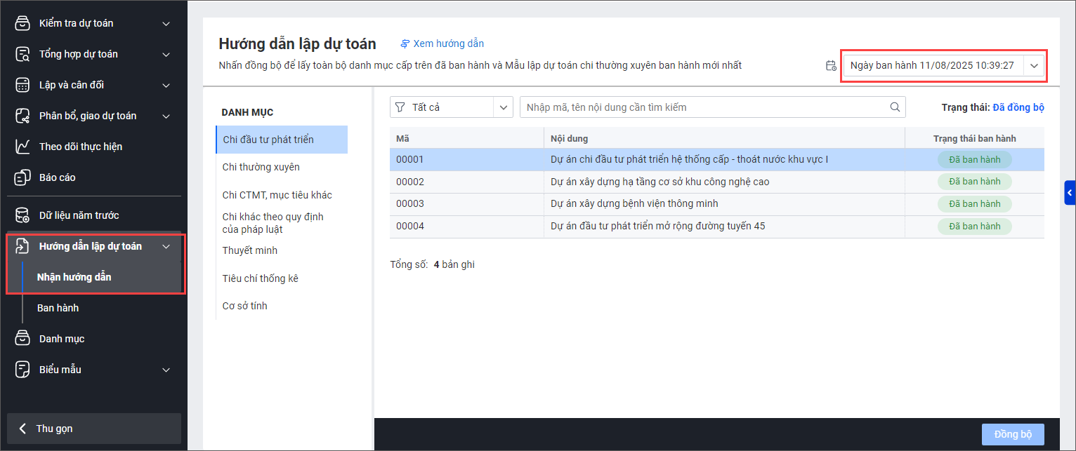 Sau khi cấp trên ban hành hướng dẫn lập dự toán, đơn vị cần đồng bộ toàn bộ danh mục mà cấp trên đã ban hành.