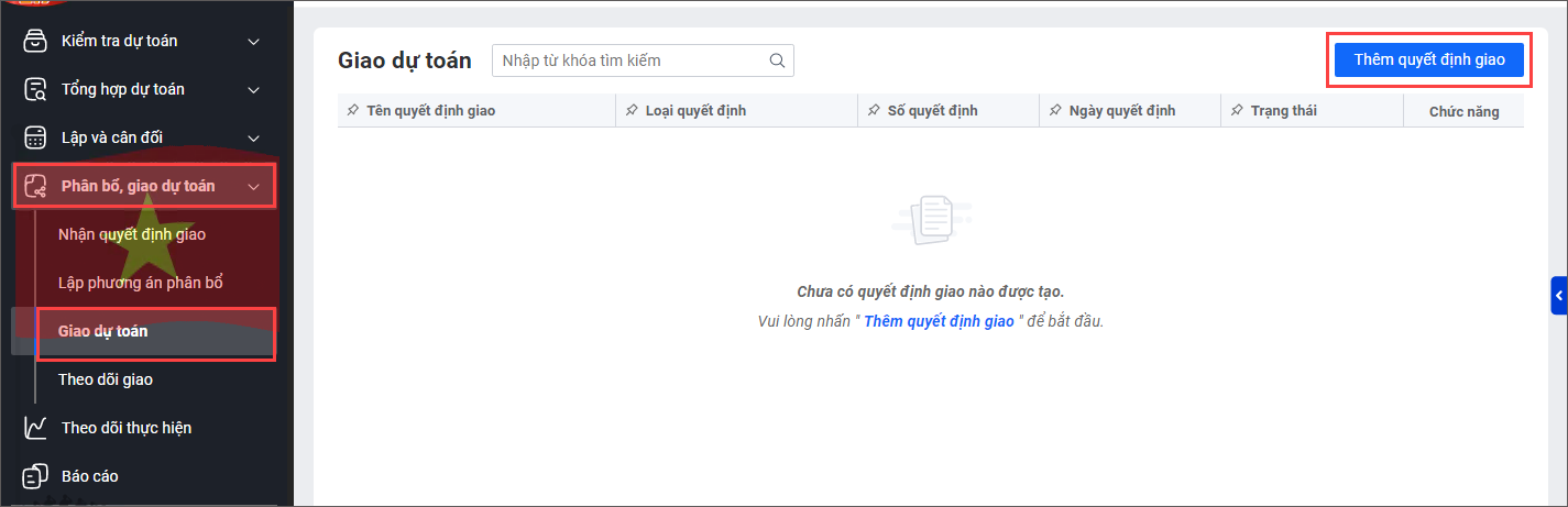 2. Nếu chưa có quyết định giao nào được tạo trước đó, nhấn Thêm quyết định giao.
