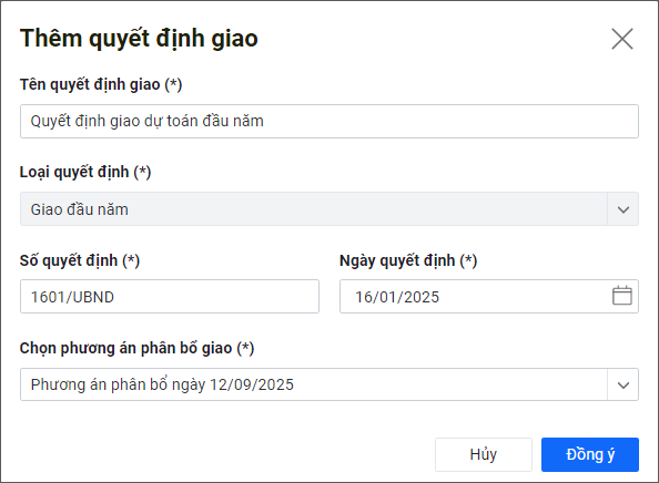 - Nhập các thông tin: Tên quyết định giao, Số quyết định, Ngày quyết định.