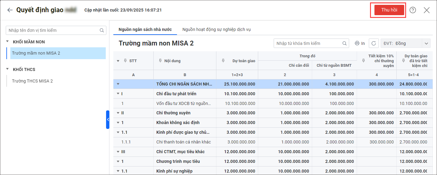 7. Sau khi giao dự toán, trạng thái của quyết định giao đó chuyển thành Đã giao. Nếu muốn thu hồi quyết định giao, nhấn vào biểu tượng Thu hồi.