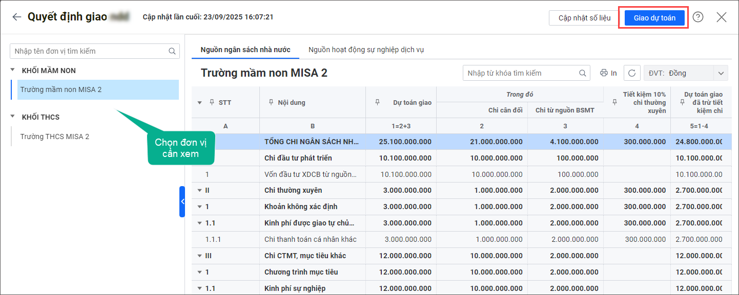 6. Sau khi kiểm tra xong, nhấn Giao dự toán để gửi quyết định giao xuống các đơn vị cấp dưới.