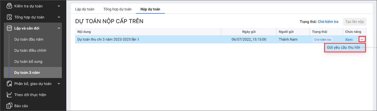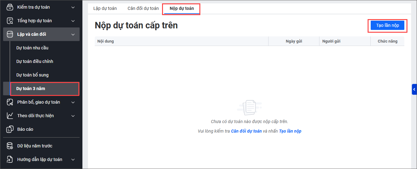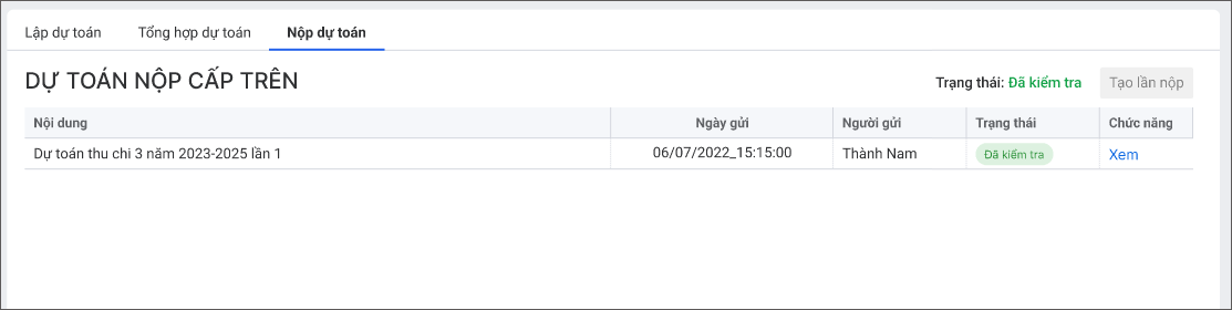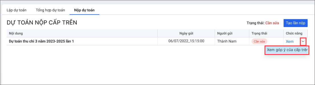 Xem góp ý của cấp trên (nếu có). Sau đó sửa lại dự toán theo góp ý của cấp trên và nộp lại bằng cách nhấn vào chức năng Tạo lần nộp.