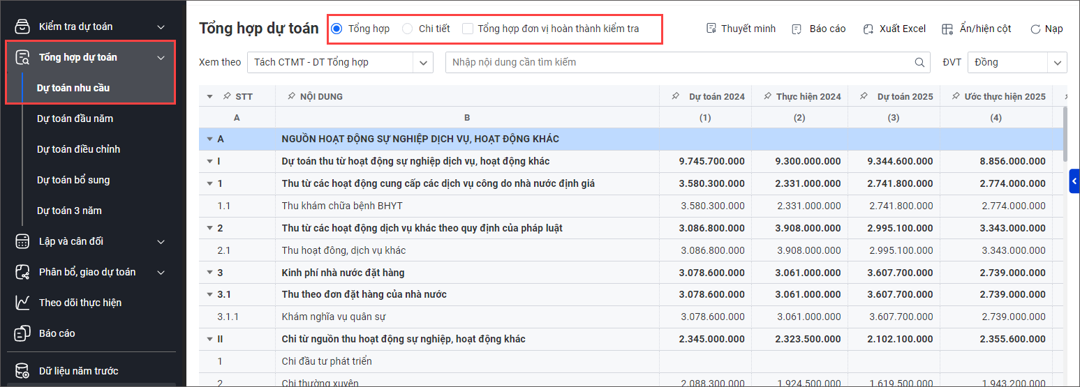 - Chương trình tự động tổng hợp dự toán thu, chi mà đơn vị đã lập. Chọn vào từng nội dung Tổng hợp, Chi tiết để xem.
